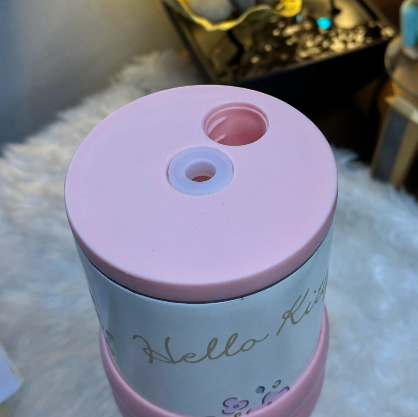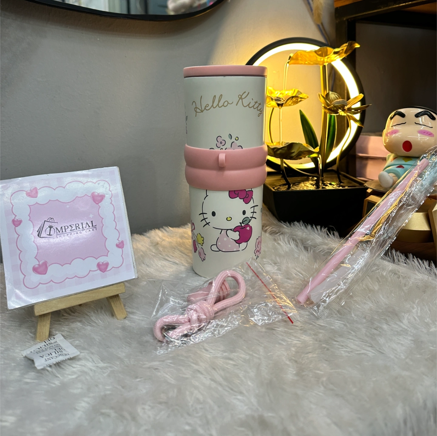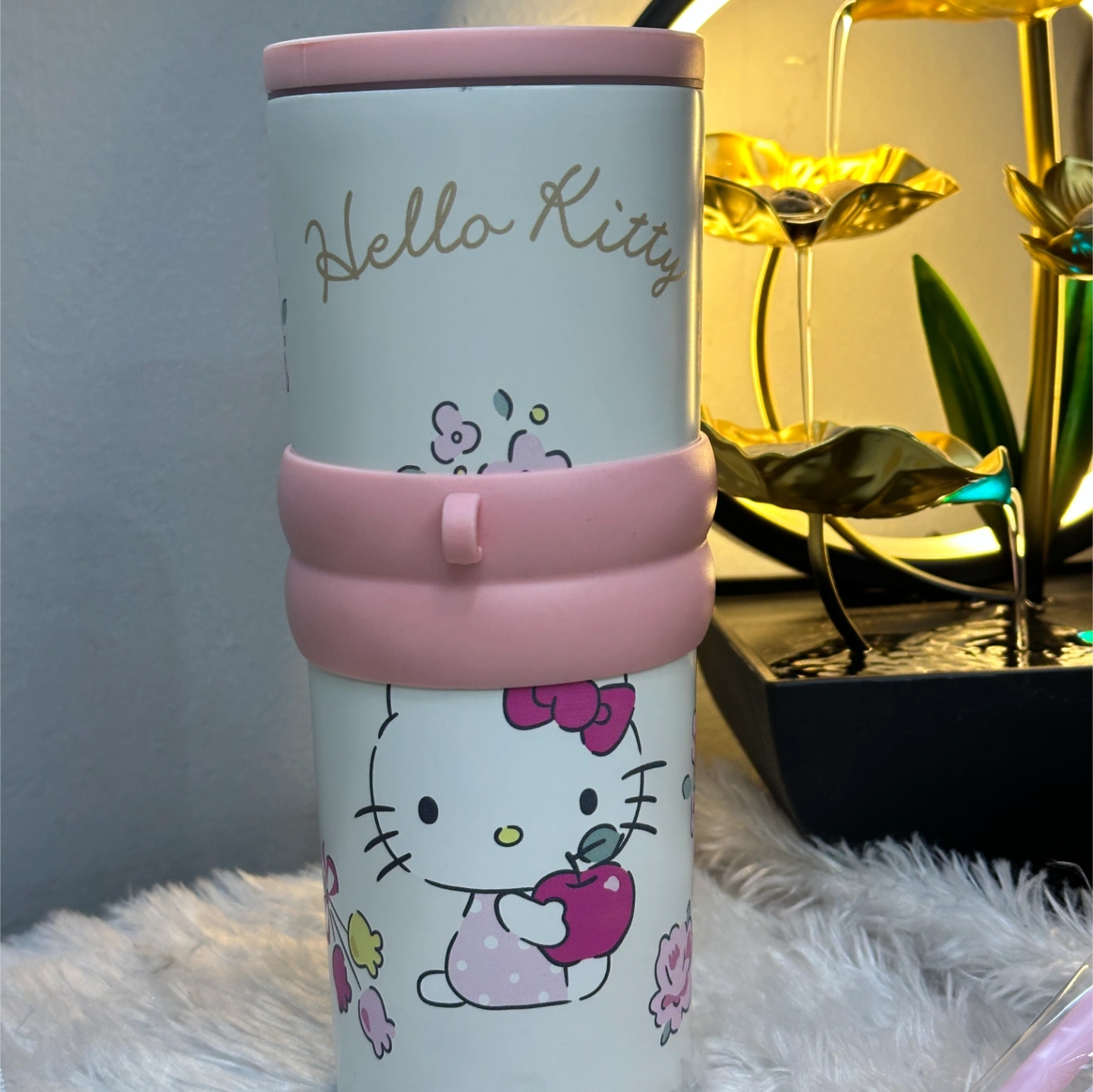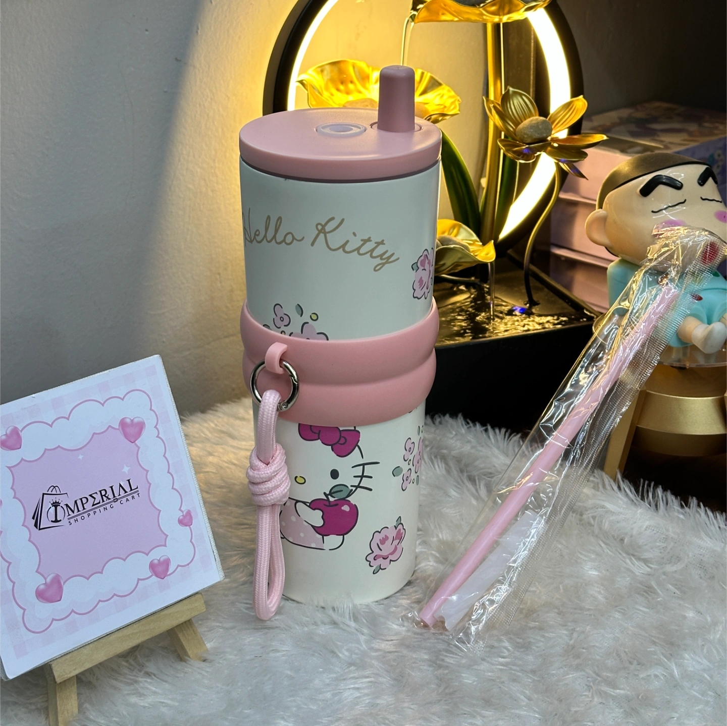 A classic Hello Kitty themed tumbler with a sophisticated matte finish and soft pink accents. It includes a specialized pink silicone grip band and a matching straw. The design features Kitty White surrounded by roses, blending nostalgia with a modern, clean aesthetic.