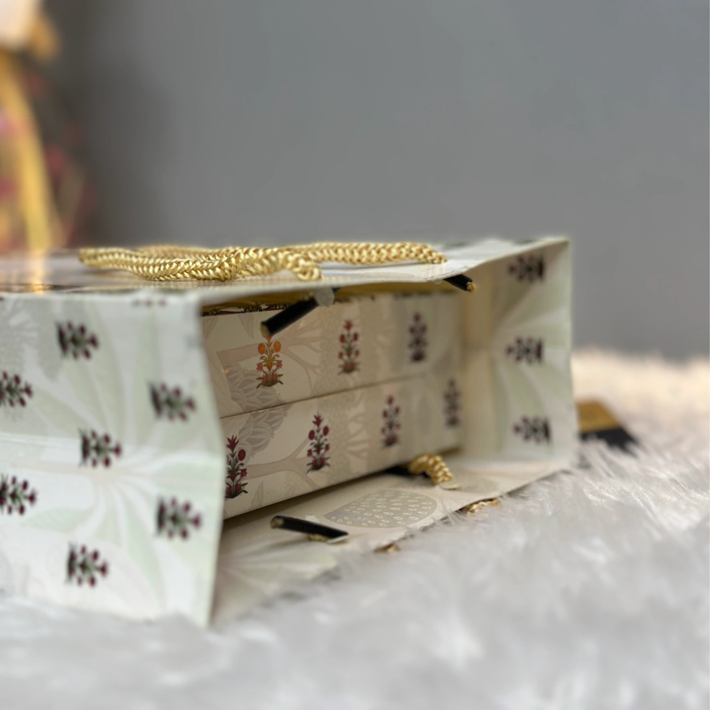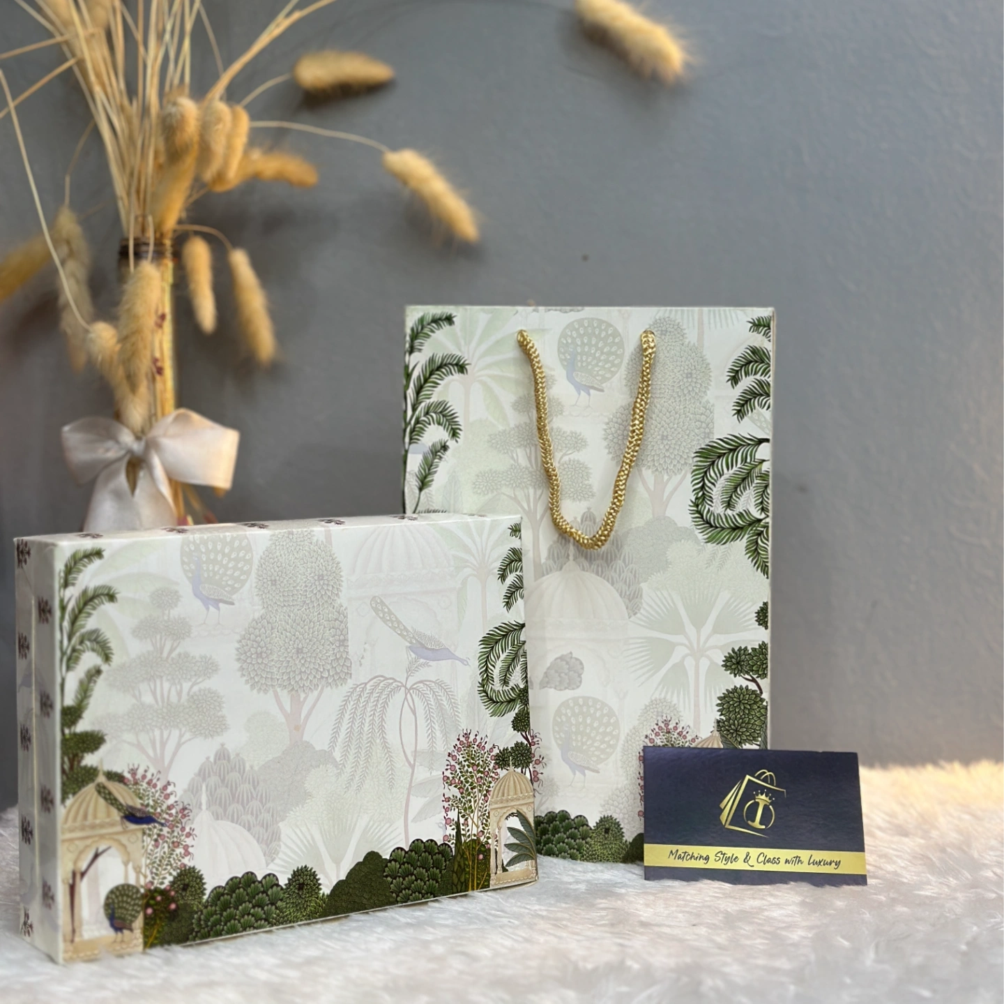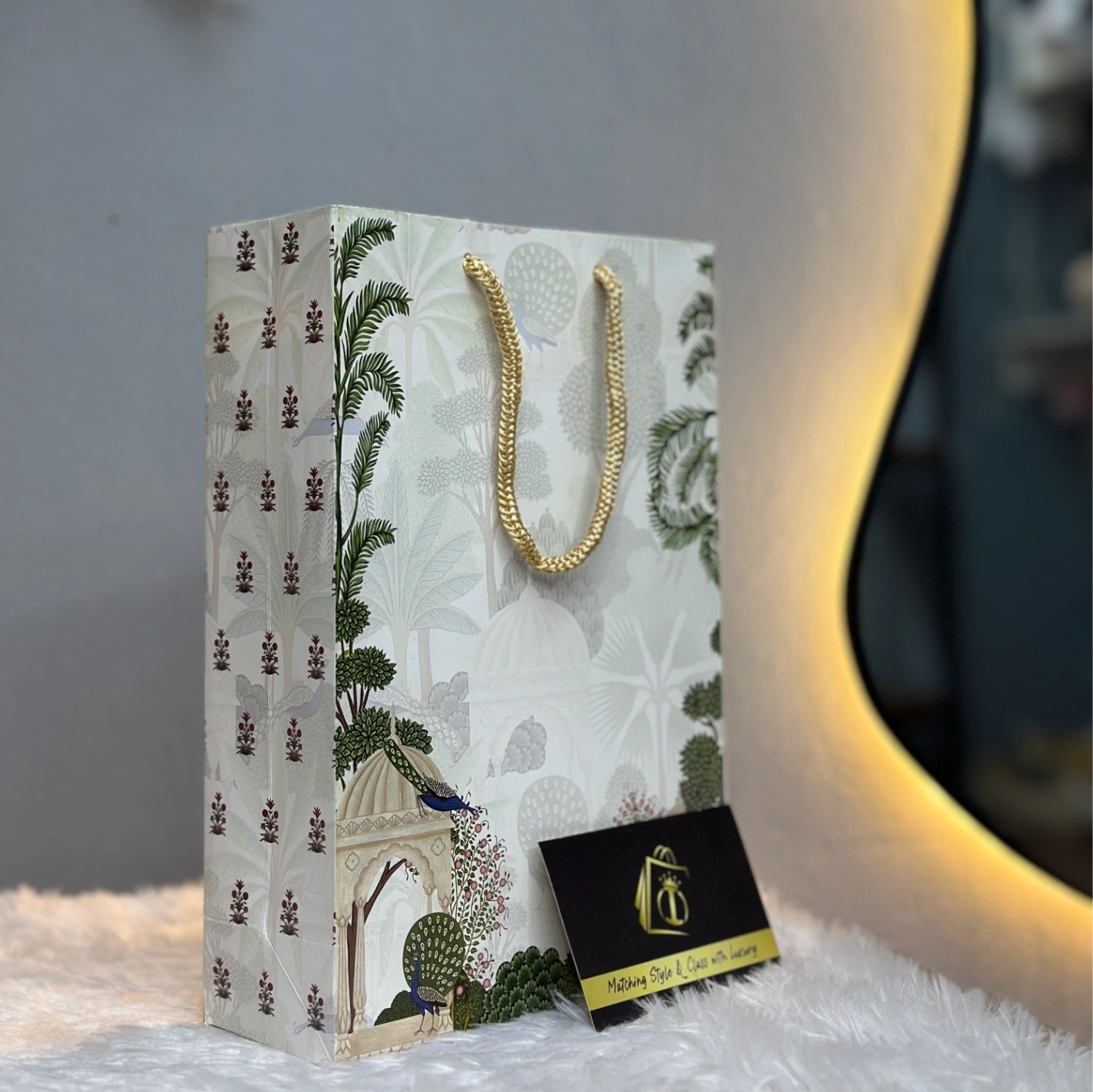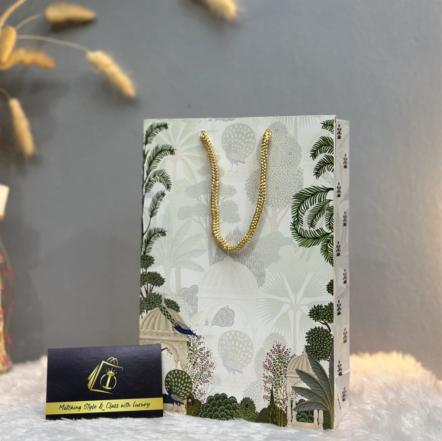 A tall, slender gift bag showcasing a vintage-inspired tropical print. The design features peacocks and arched architecture in muted greens and creams, accented by gold rope handles.