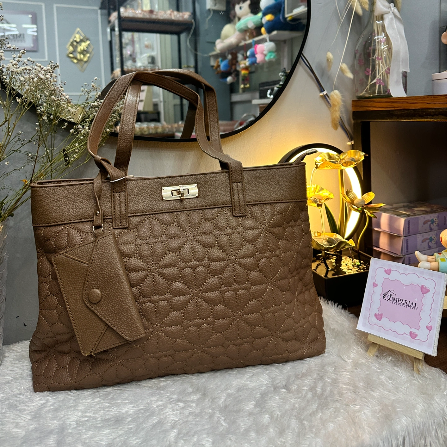 This is a larger, rectangular tote featuring an intricate, 3D quilted floral or "petal" pattern throughout the body. It includes a small matching pouch clipped to the handle for easy access to coins or keys. The gold twist-lock closure on the top rim adds a touch of elegance to this spacious, functional piece.