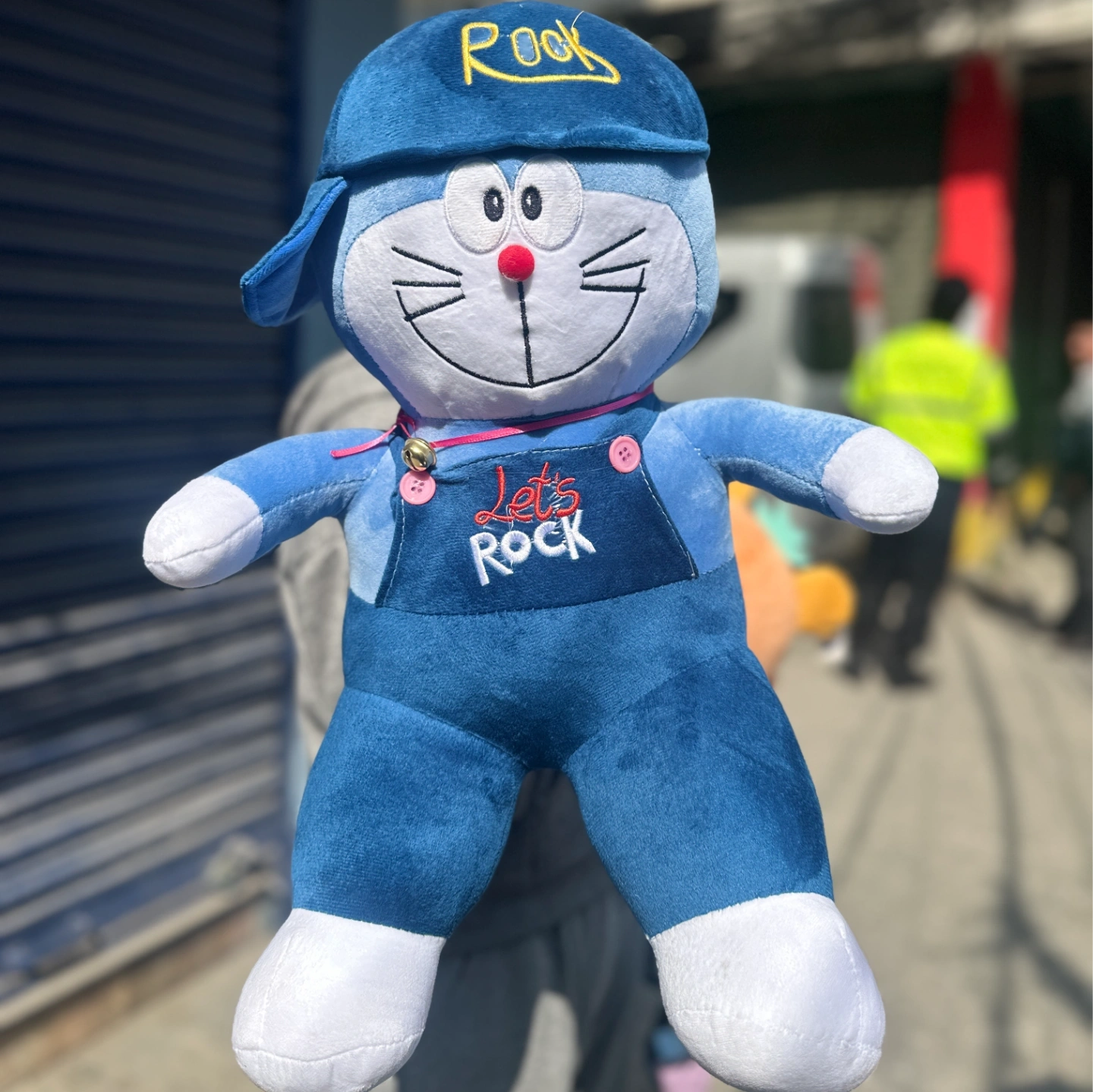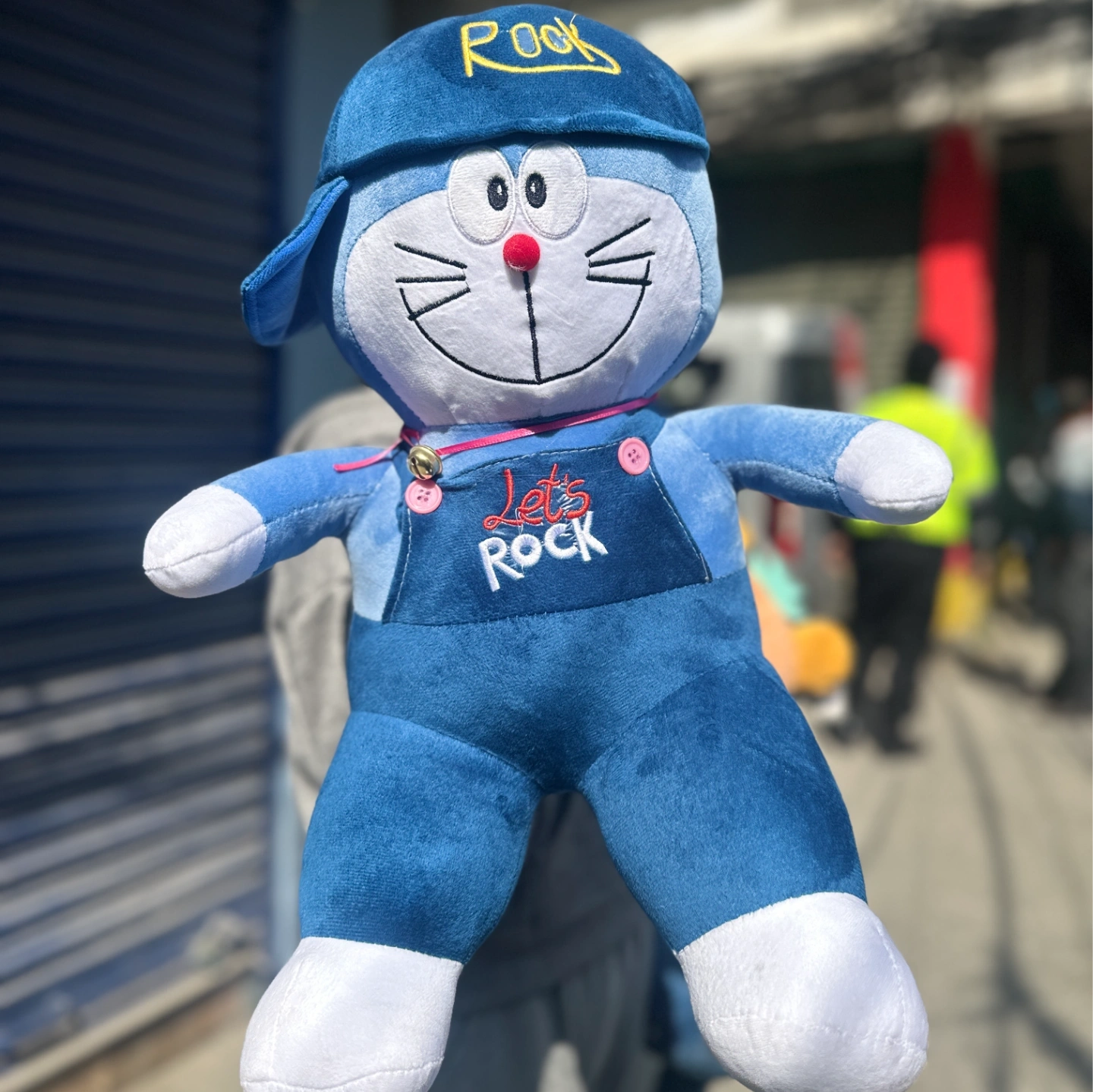 A cool twist on the classic character, this Doraemon wears a blue "Rock" baseball cap and matching denim-style overalls.