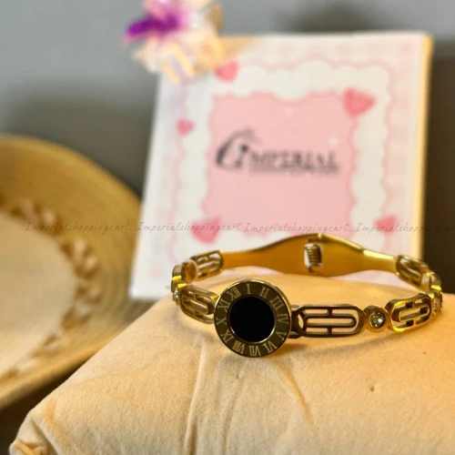 A vintage-inspired piece featuring a black enamel center framed by gold Roman numerals and a unique geometric link chain.