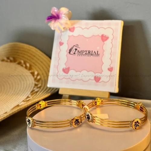 A pair of elegant triple-wire bangles adorned with black enamel floral clovers and micro-crystal borders.