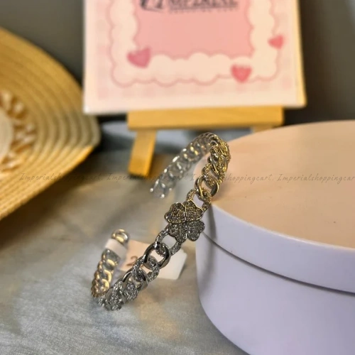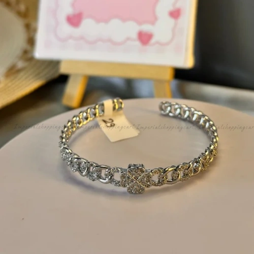 A stunning silver-toned open cuff featuring a central four-leaf clover motif and sparkling pavé accents along a chain-link silhouette.