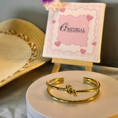 A sophisticated gold-plated double-band cuff centered with a sleek "love knot" symbol, representing strength and connection.