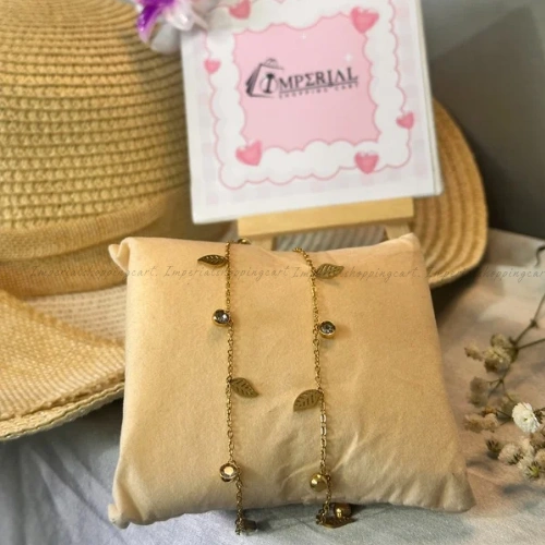 A delicate gold chain featuring tiny polished leaves and bezel-set crystal "dewdrops" for a nature-inspired aesthetic.