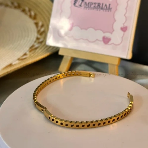 A minimalist gold bangle featuring a precision-cut hollow rectangular pattern for a contemporary, architectural look.