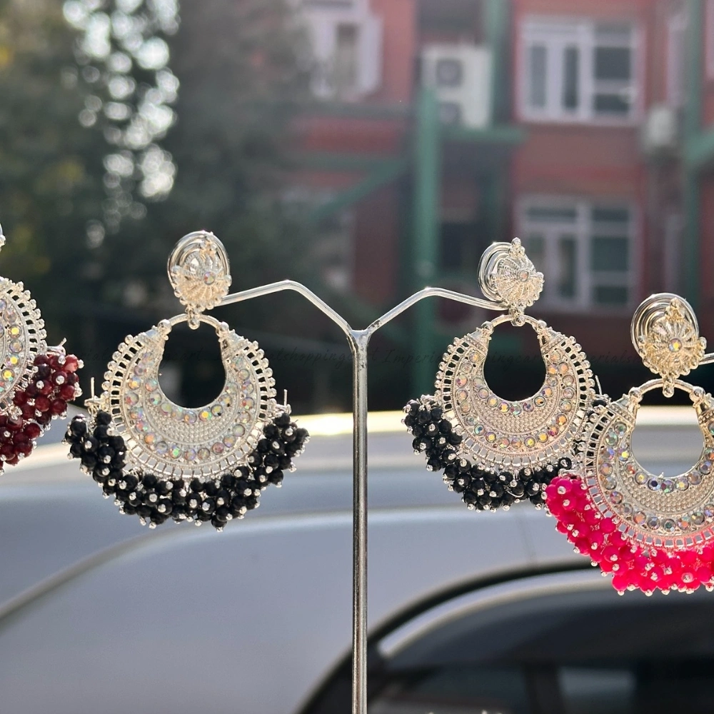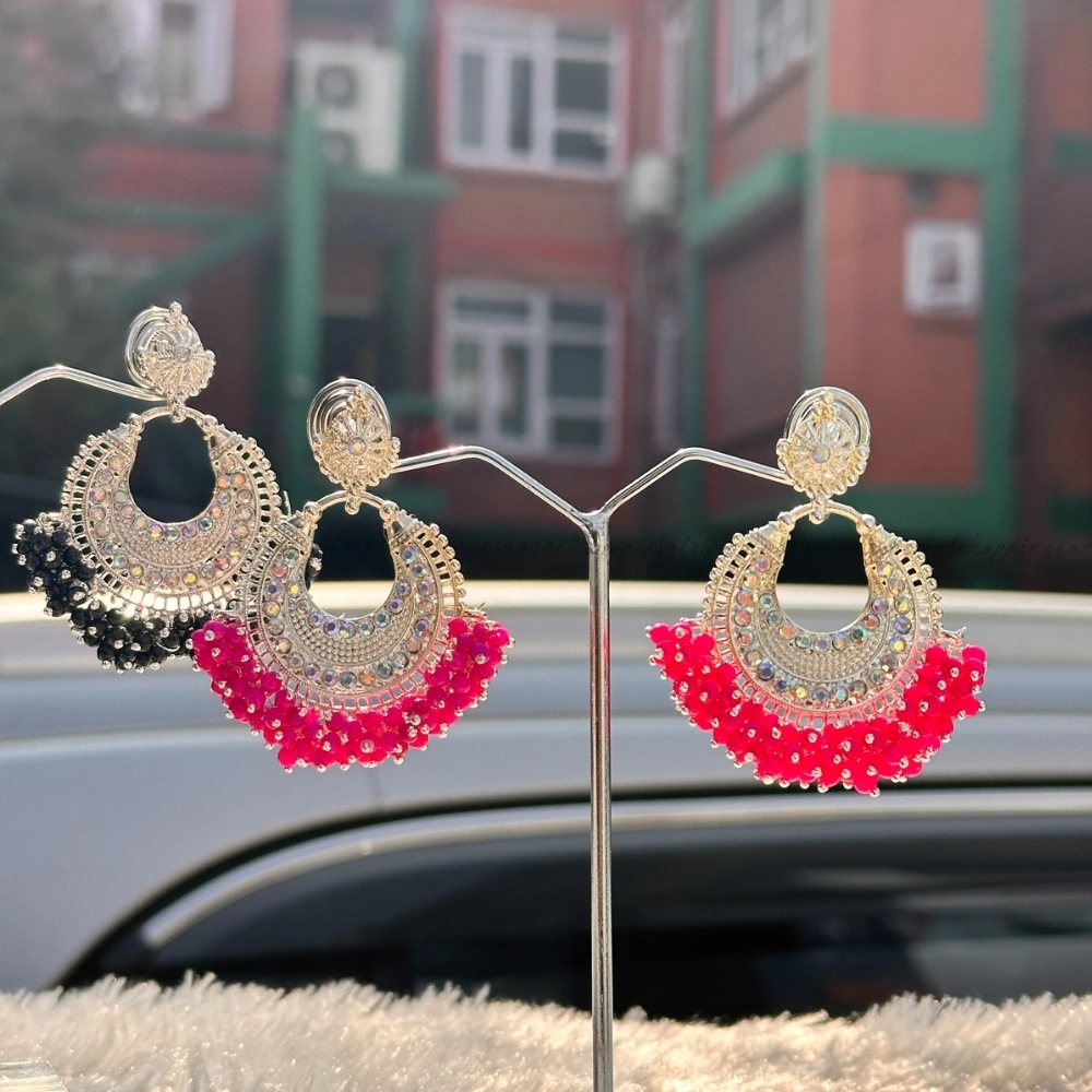 Available in striking pink and deep black, these crescent-shaped (Chandbali) earrings are encrusted with shimmering iridescent crystals. The bottom is fringed with a thick layer of colorful glass beads, creating a bold, statement-making silhouette.