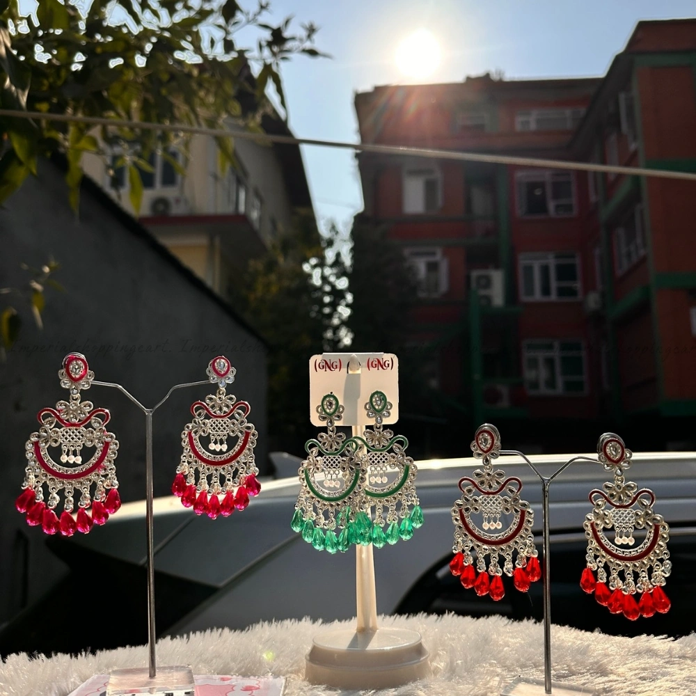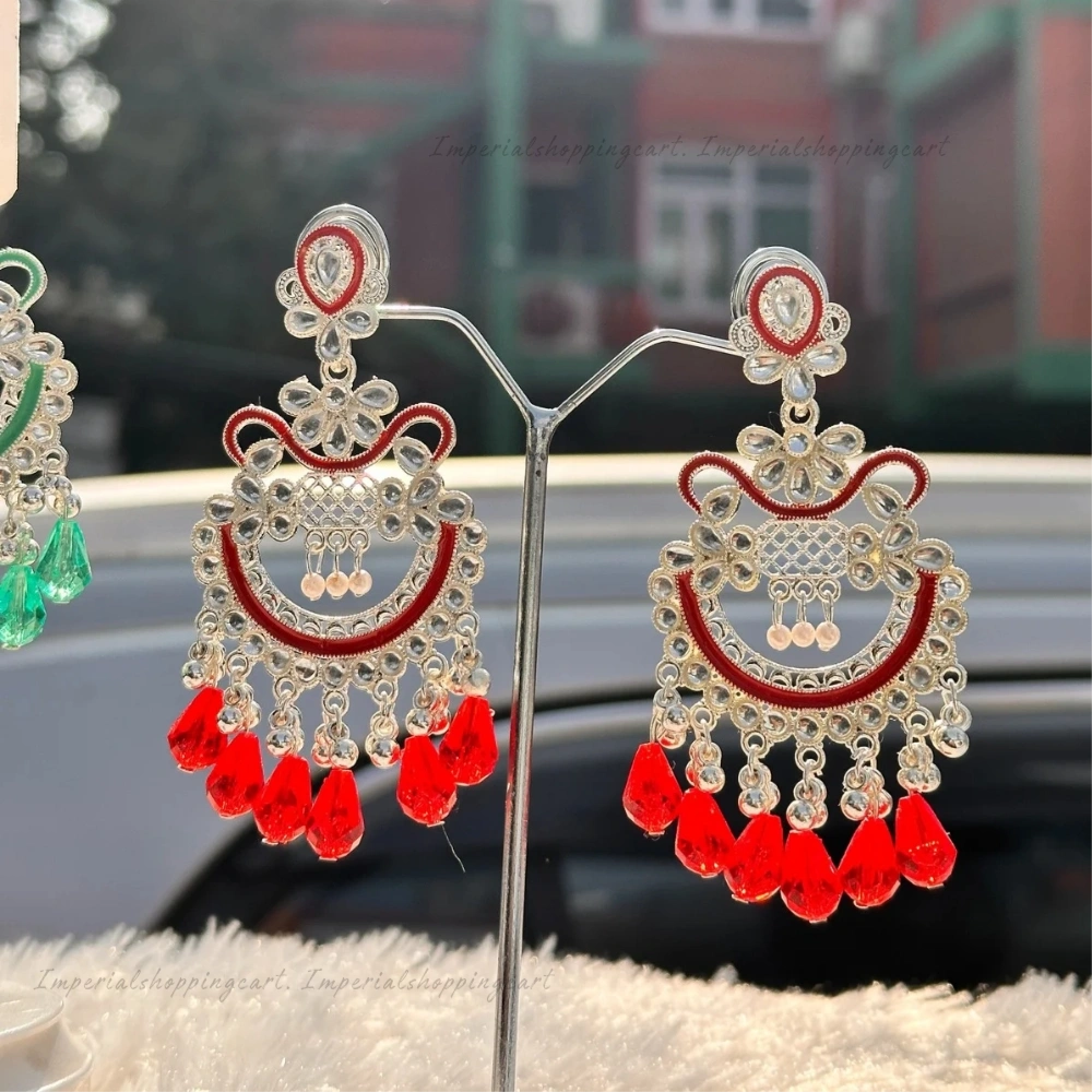 These intricate earrings come in vivid shades of emerald green, ruby red, and magenta. Featuring a mesh-work crescent design and finished with polished teardrop beads, they are inspired by traditional Indian Meenakari craftsmanship.