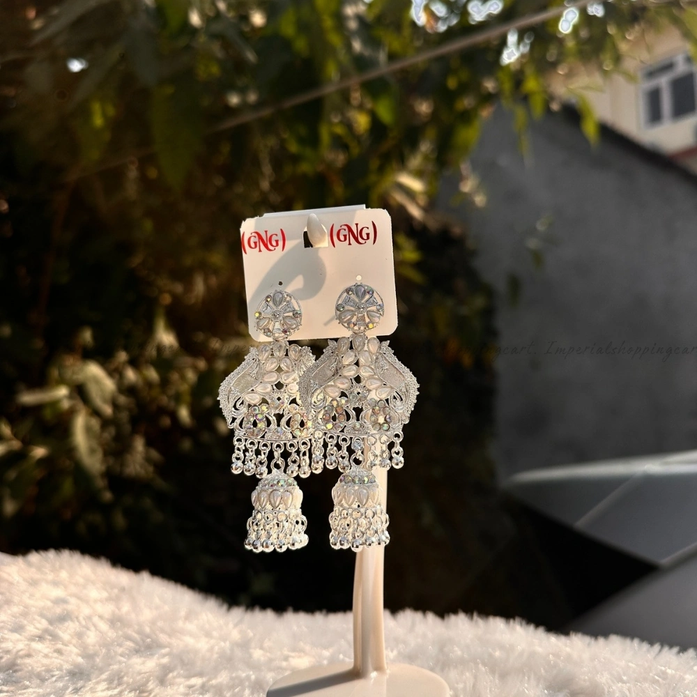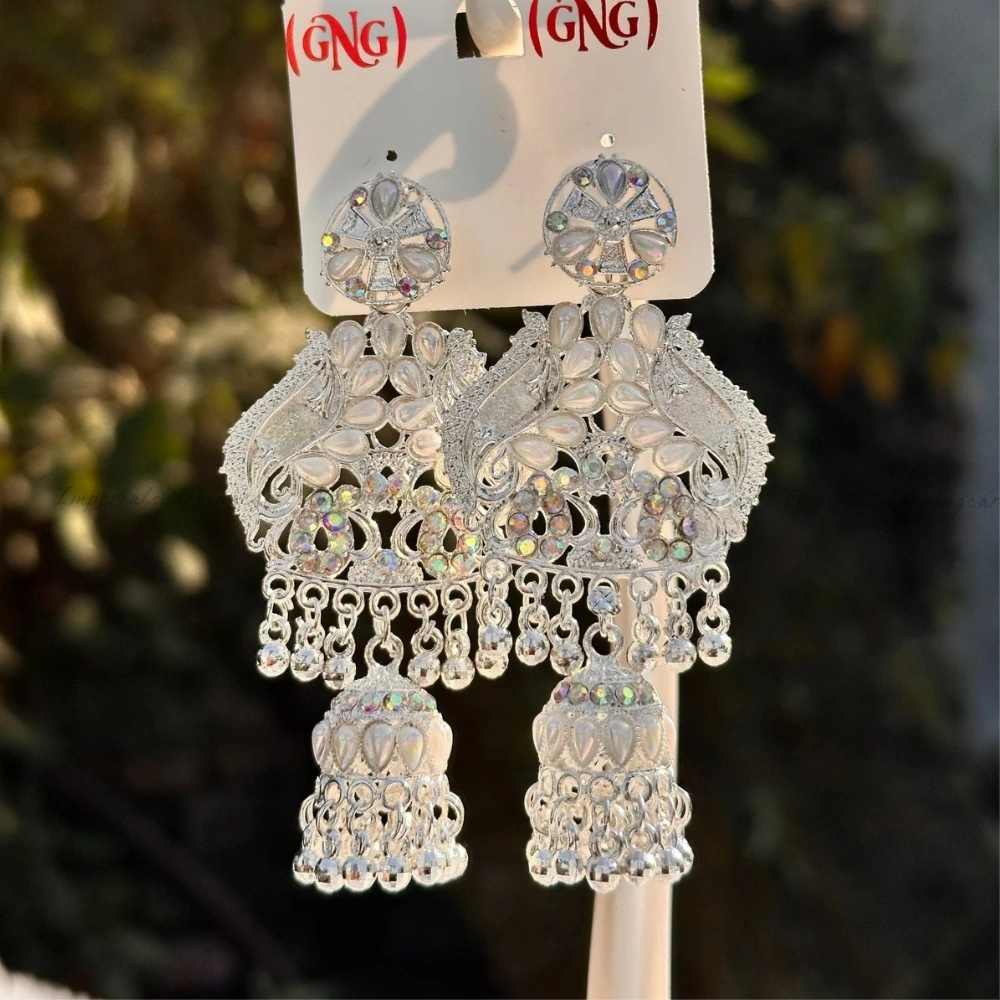 These grand earrings feature a detailed peacock motif in a silver-finish setting. Adorned with pearlescent stones and iridescent crystals, the design flows into a classic jhumka bell with tiny metallic droplets for a regal, traditional look.