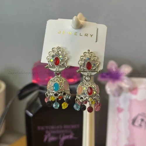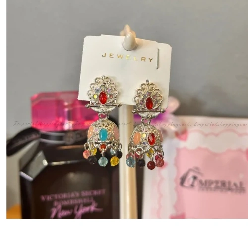 Playful and colorful silver-toned earrings featuring a mix of red, turquoise, and amber-colored stones. The multi-colored bead fringe at the bottom gives them a vibrant, bohemian flair.