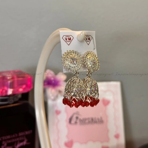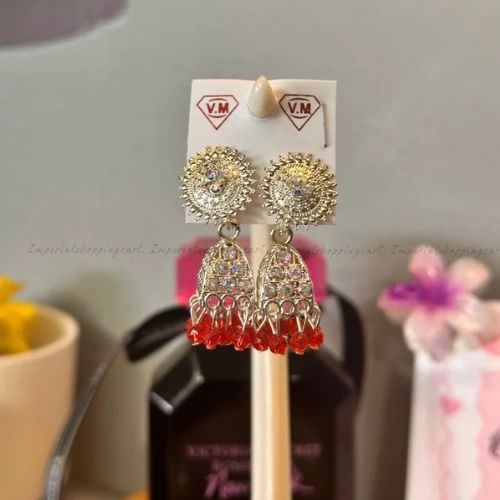 Dainty silver-toned earrings with a sunburst-style stud and a small bell-shaped drop. Accented with tiny red beads, these are ideal for those who prefer lightweight traditional jewelry.