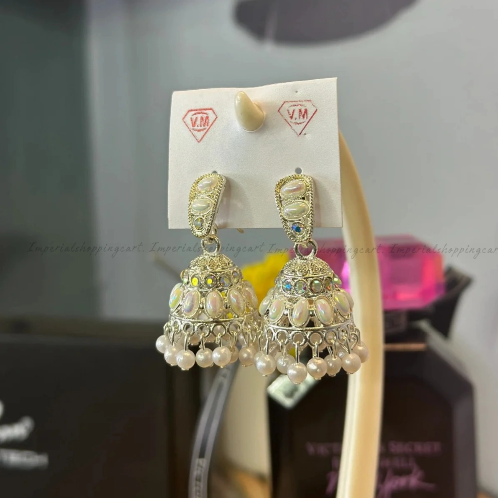 Unique silver-toned earrings featuring smooth, opal-like oval stones on the stud and the bell. The soft glow of the stones paired with white pearl beads creates a calm and elegant look.