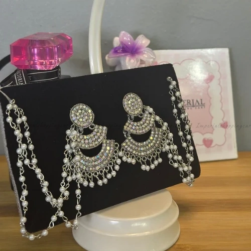 These statement earrings feature a triple-tiered crescent (Chandbali) design. Every tier is pavé-set with iridescent crystals that catch the light beautifully. They come with attached multi-strand pearl "Sahara" chains that drape over the ear and pin into the hair, adding a regal, heavy-bridal feel to the set.