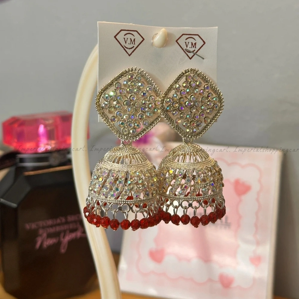 Traditional bell-shaped (Jhumka) earrings featuring a large diamond-shaped stud encrusted with iridescent crystals. The base is finished with vibrant red (ruby-style) beads for a classic ethnic look.