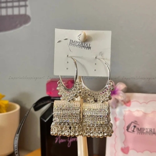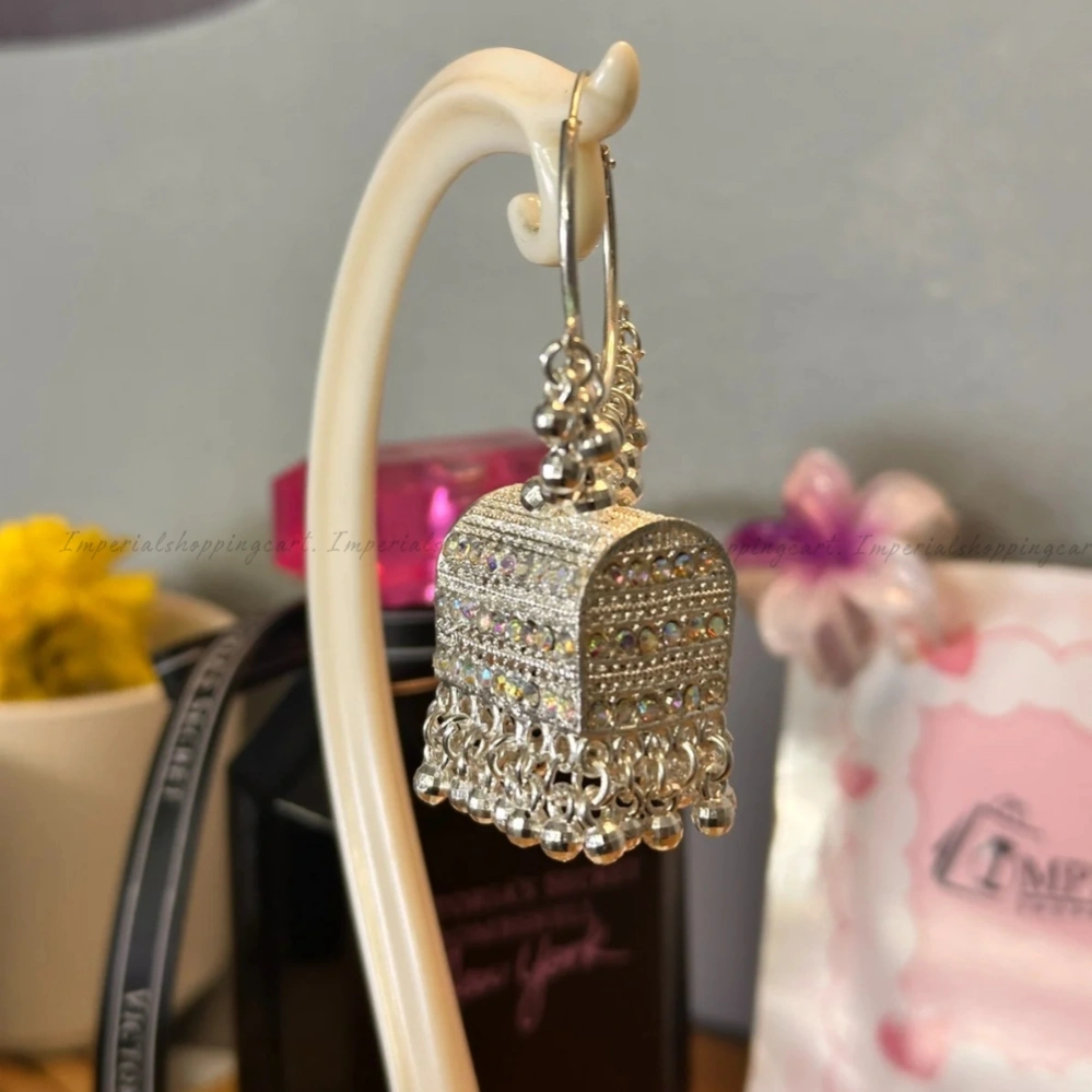 The top features a polished silver-tone hoop that transitions into a decorative crescent arc. From this arc hangs a structured, square-shaped bell (Jhumka) adorned with shimmering rhinestones and a fringe of silver metallic beads.