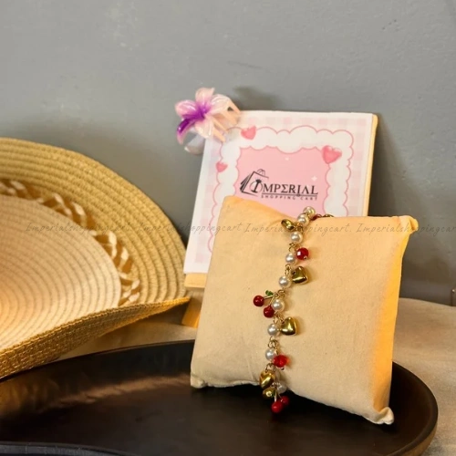 A whimsical and feminine bracelet featuring glossy white pearls, gold-tone heart charms, and vibrant red cherry accents. A playful addition to any summer outfit.
