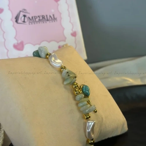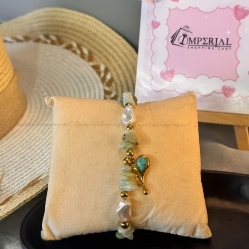A beautiful mix of raw-cut seafoam stones and organic-shaped pearls, accented by a gold-tone abstract charm with a turquoise inlay.