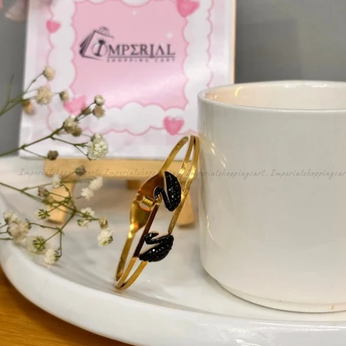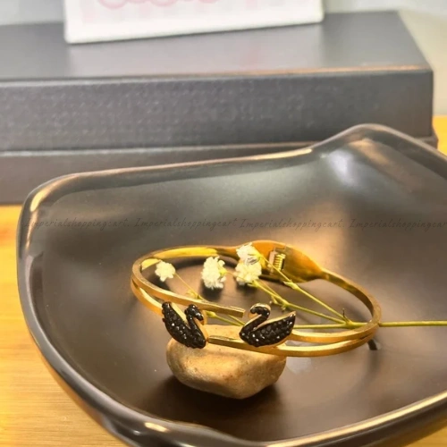This striking gold-finished cuff features two graceful swans facing each other, encrusted with shimmering black crystals. A bold, luxurious piece for evening wear.