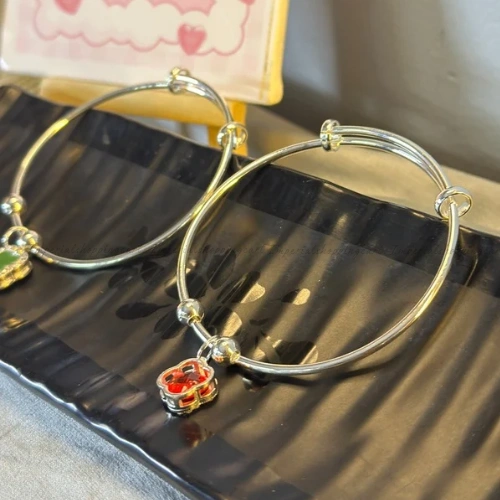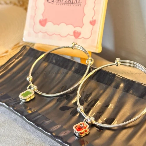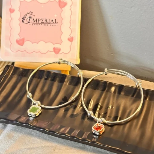 These minimalist adjustable bangles feature vibrant square-cut gemstone charms in emerald green and ruby red. Great for stacking or wearing solo.