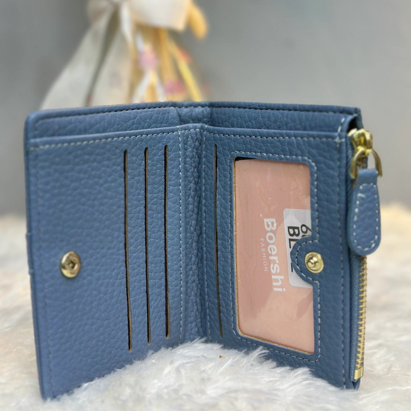 A sleek, modern solution for the minimalist traveler. This compact wallet is crafted in a refreshing sky-blue pebbled finish with durable white contrast stitching. It features a secure side-zip compartment for coins and a slim profile that fits comfortably in a pocket or small clutch.