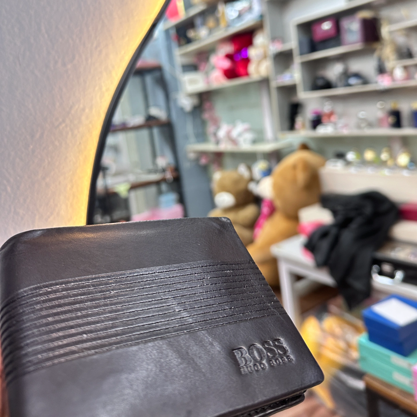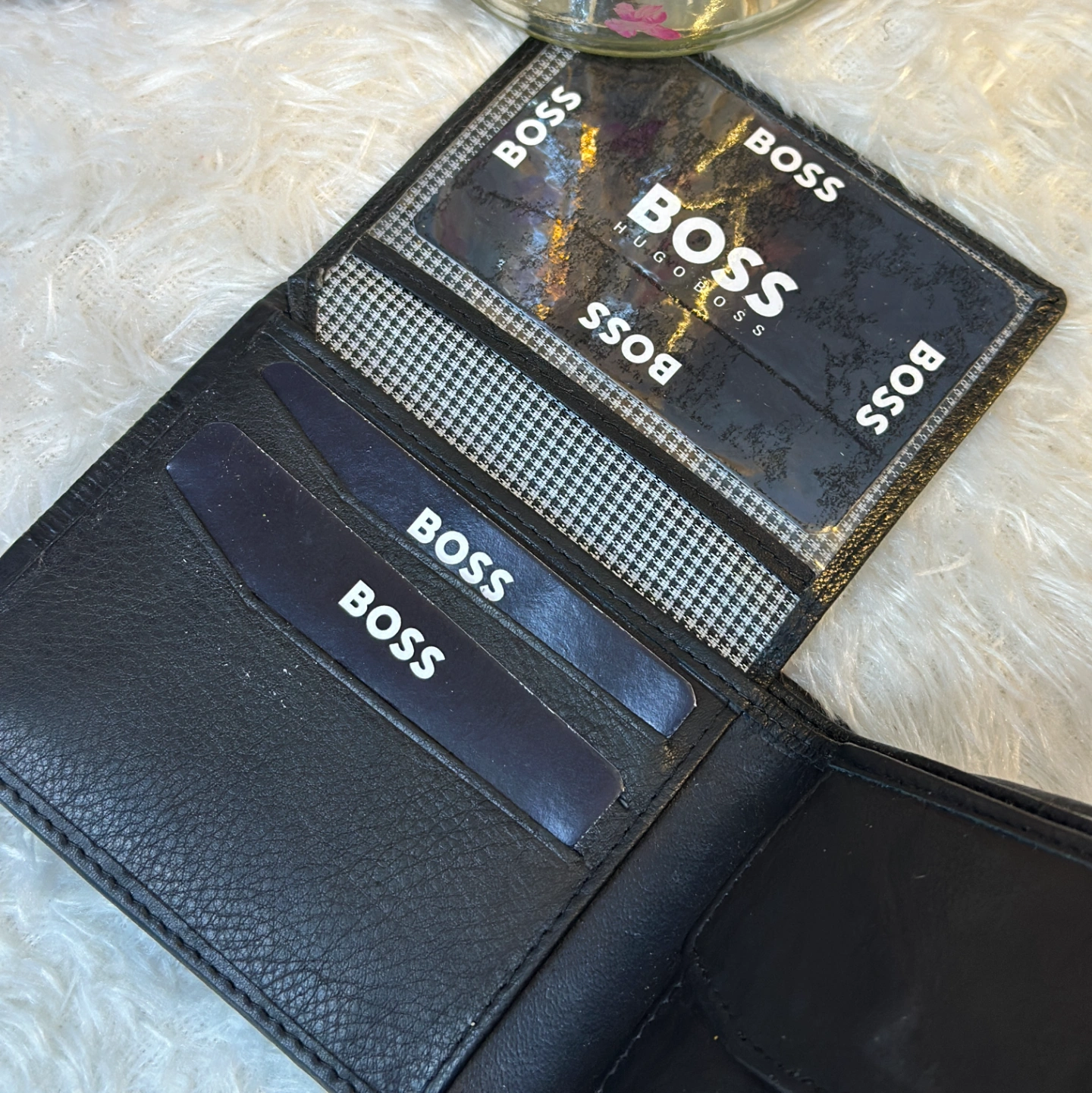 Description: This set features a classic BOSS (Hugo Boss) bifold wallet. item are crafted from premium black leather with a subtle pebbled texture and feature the silver-tone BOSS logo.