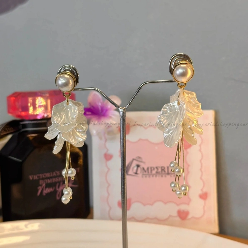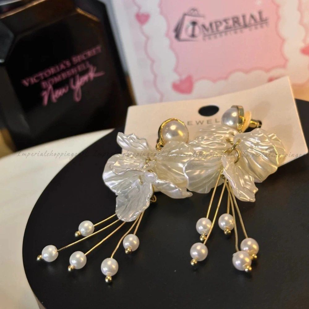 Romantic white lily petals paired with elegant gold-tone wire "stems" that drop into delicate dangling pearls. Perfect for bridal or evening wear.