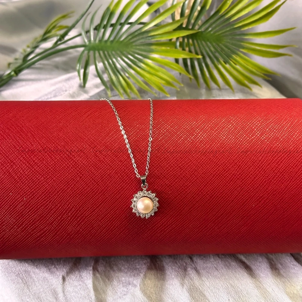 A timeless silver-tone chain featuring a stunning pinkish-cream pearl centerpiece, surrounded by a delicate "sunburst" halo of shimmering crystals. Perfect for classic elegance.