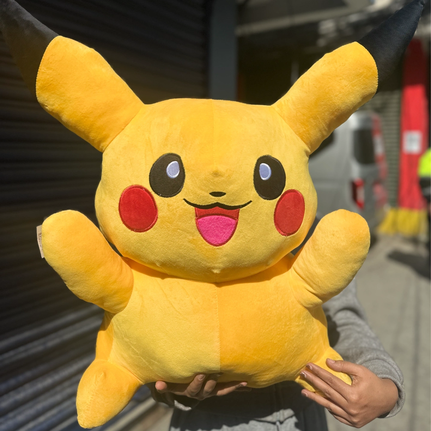 A bright, high-energy Pikachu plush with its signature rosy cheeks and a wide, happy open-mouthed expression.