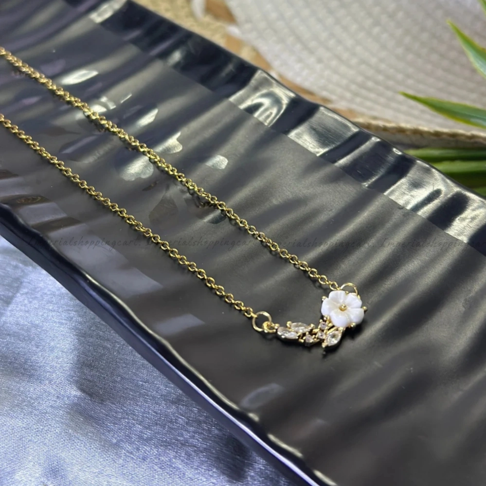 This delicate piece features a small white flower set off-center with crystal "leaves" trailing along the chain. It offers a refined, asymmetrical look that is subtle enough for the office but elegant enough for a wedding.