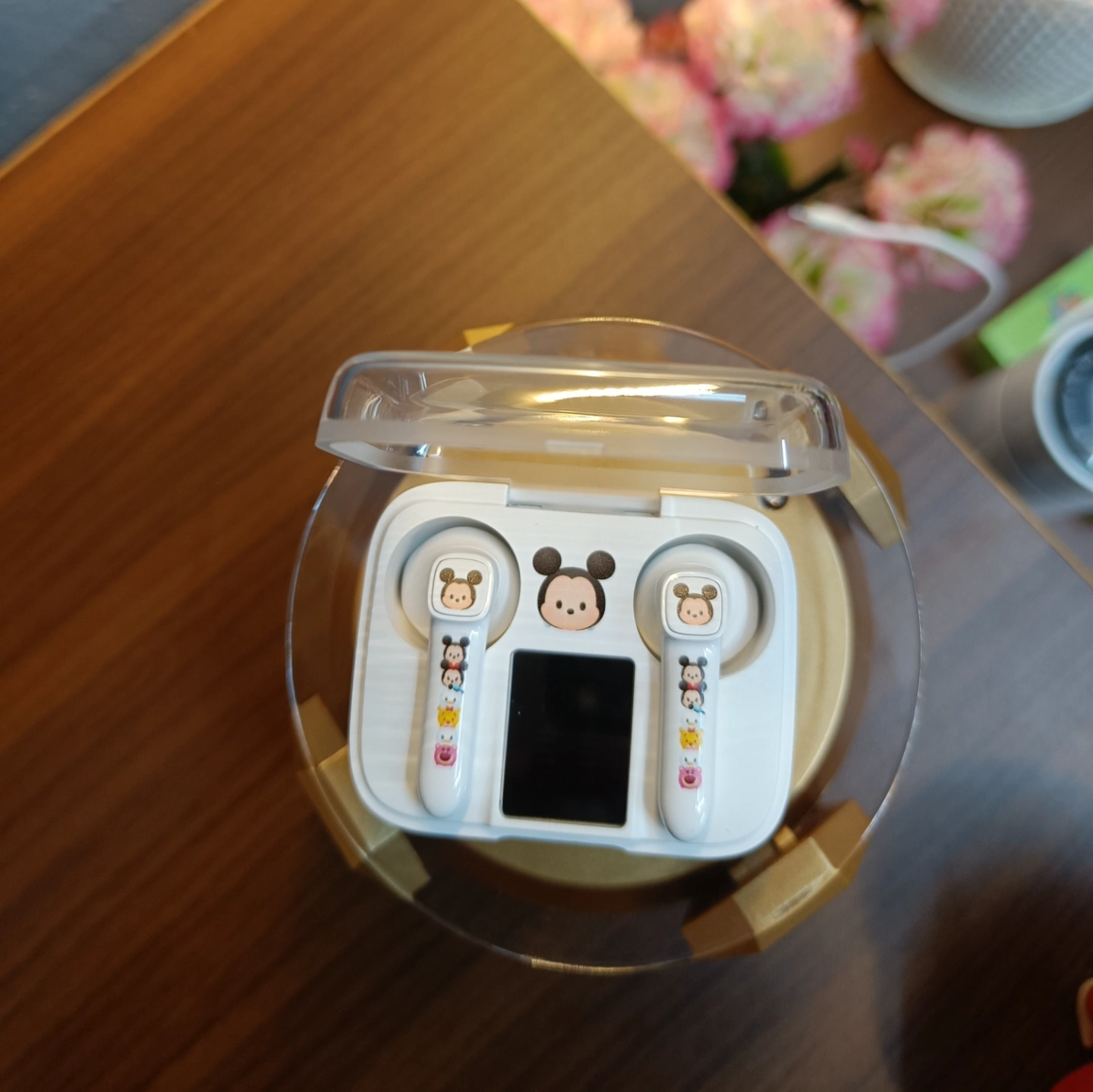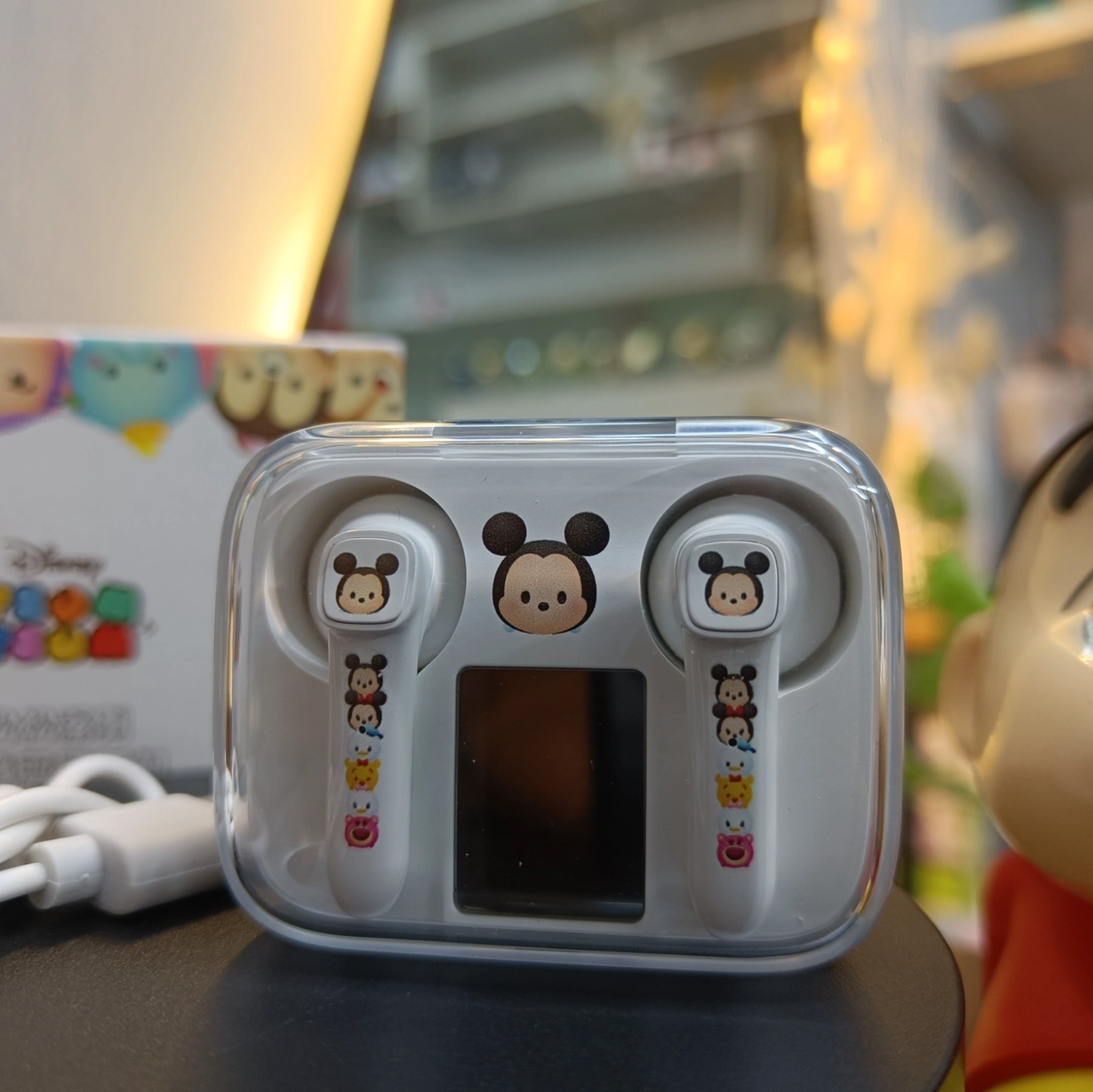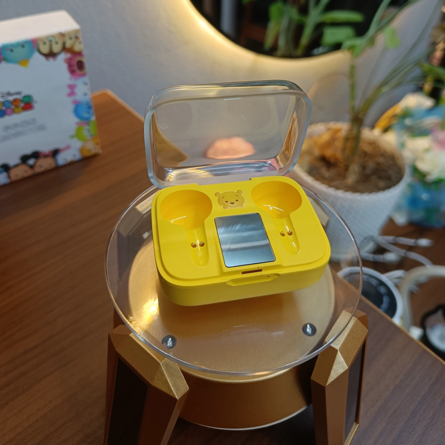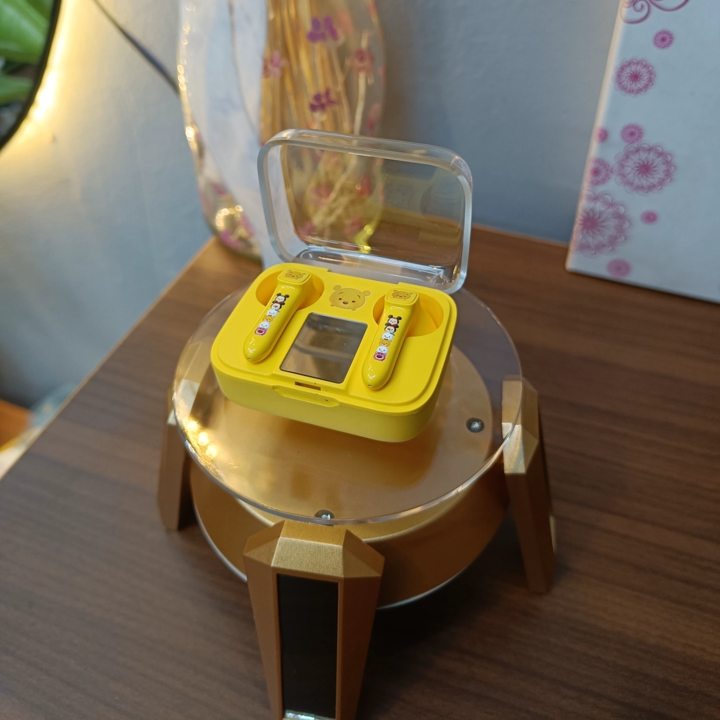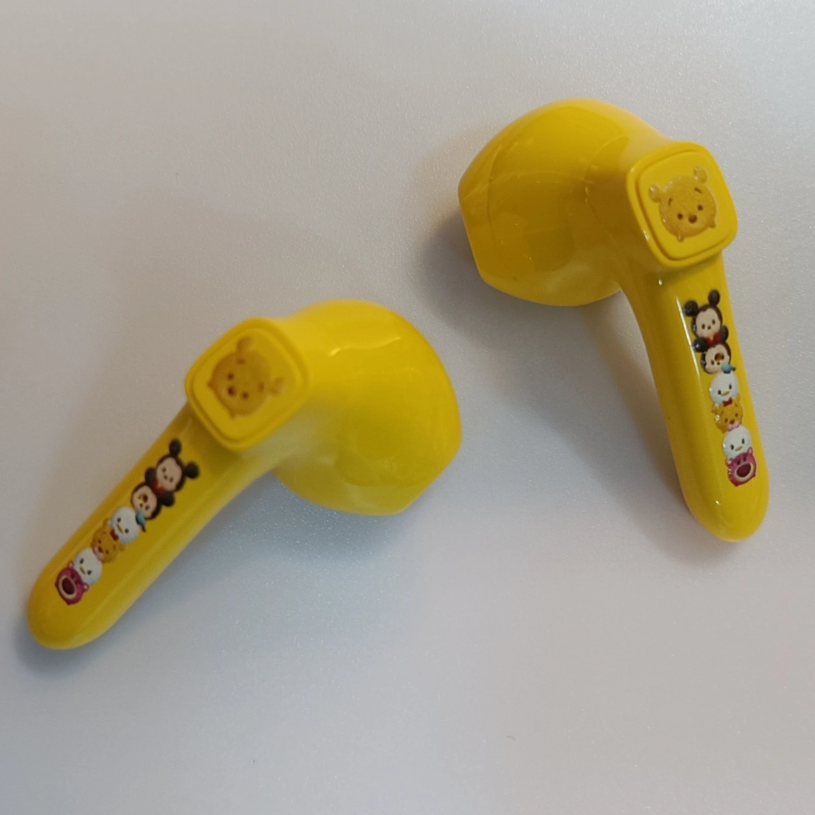 Bring the fun of Disney's Tsum Tsum to your music! These bright yellow wireless earbuds feature adorable character decals and come in a matching, compact charging case. Enjoy clear sound and hands-free convenience with a playful, eye-catching design.