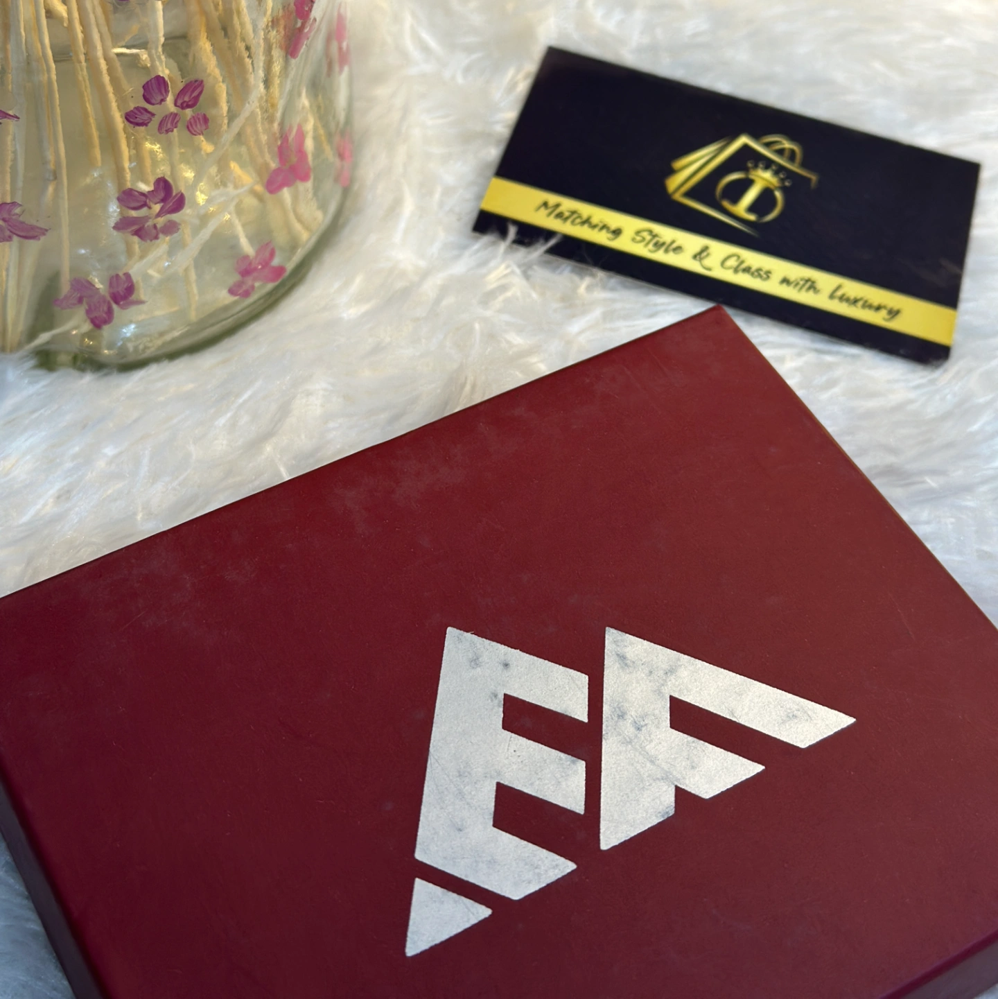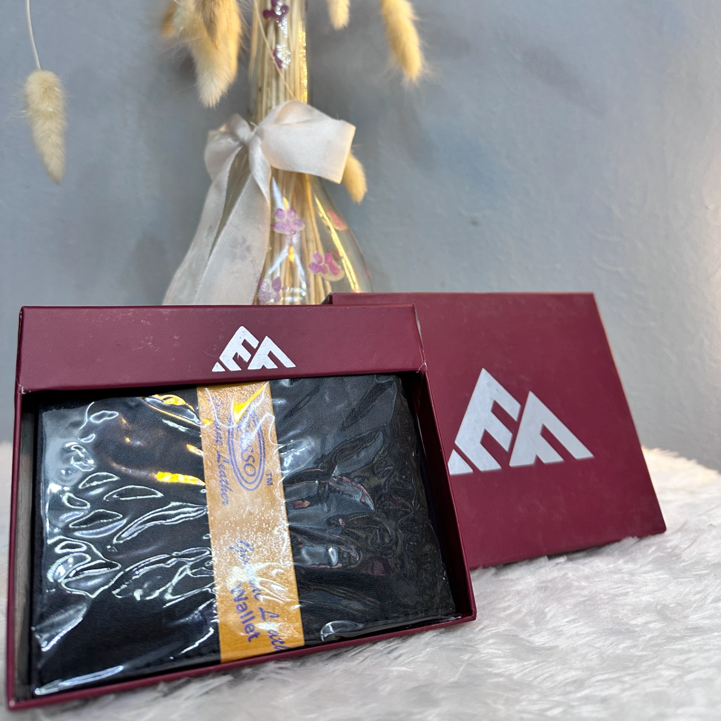 This wallet features a unique circular "EA" logo with a mountain peak silhouette, often presented in a premium burgundy or deep red box.