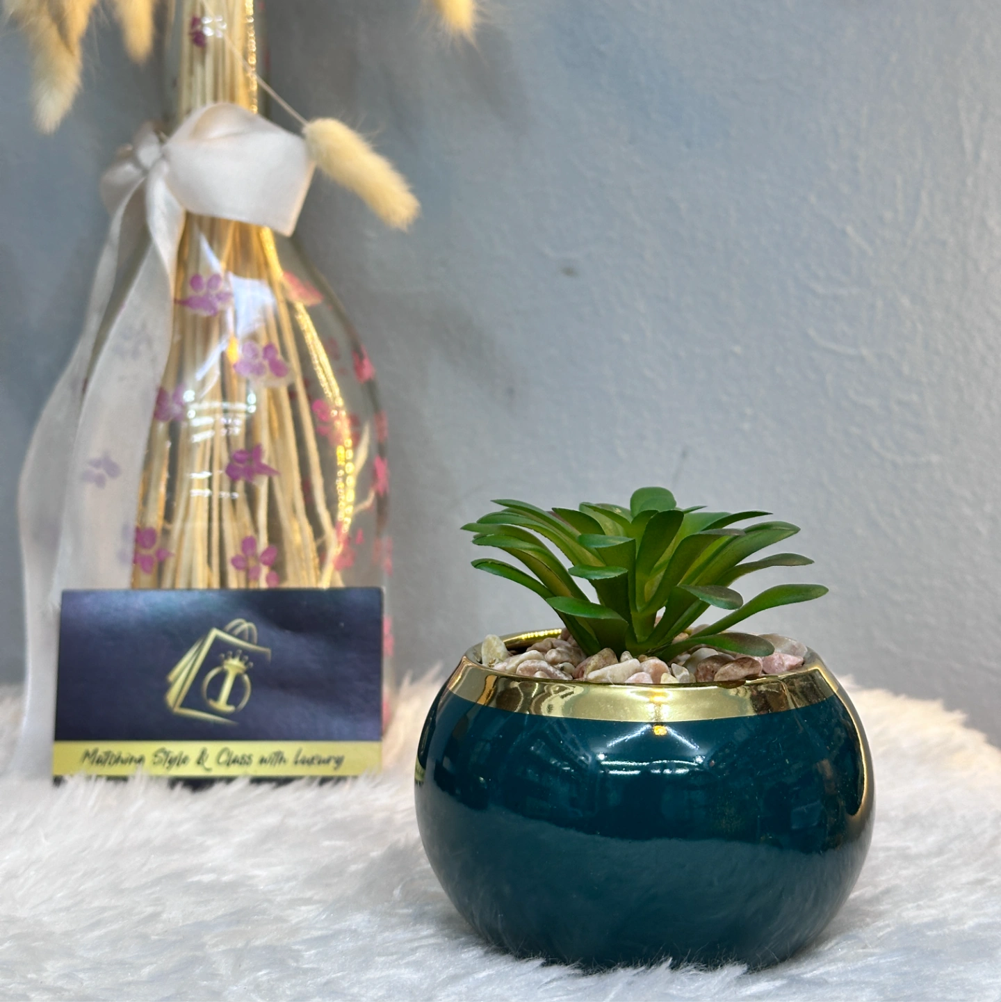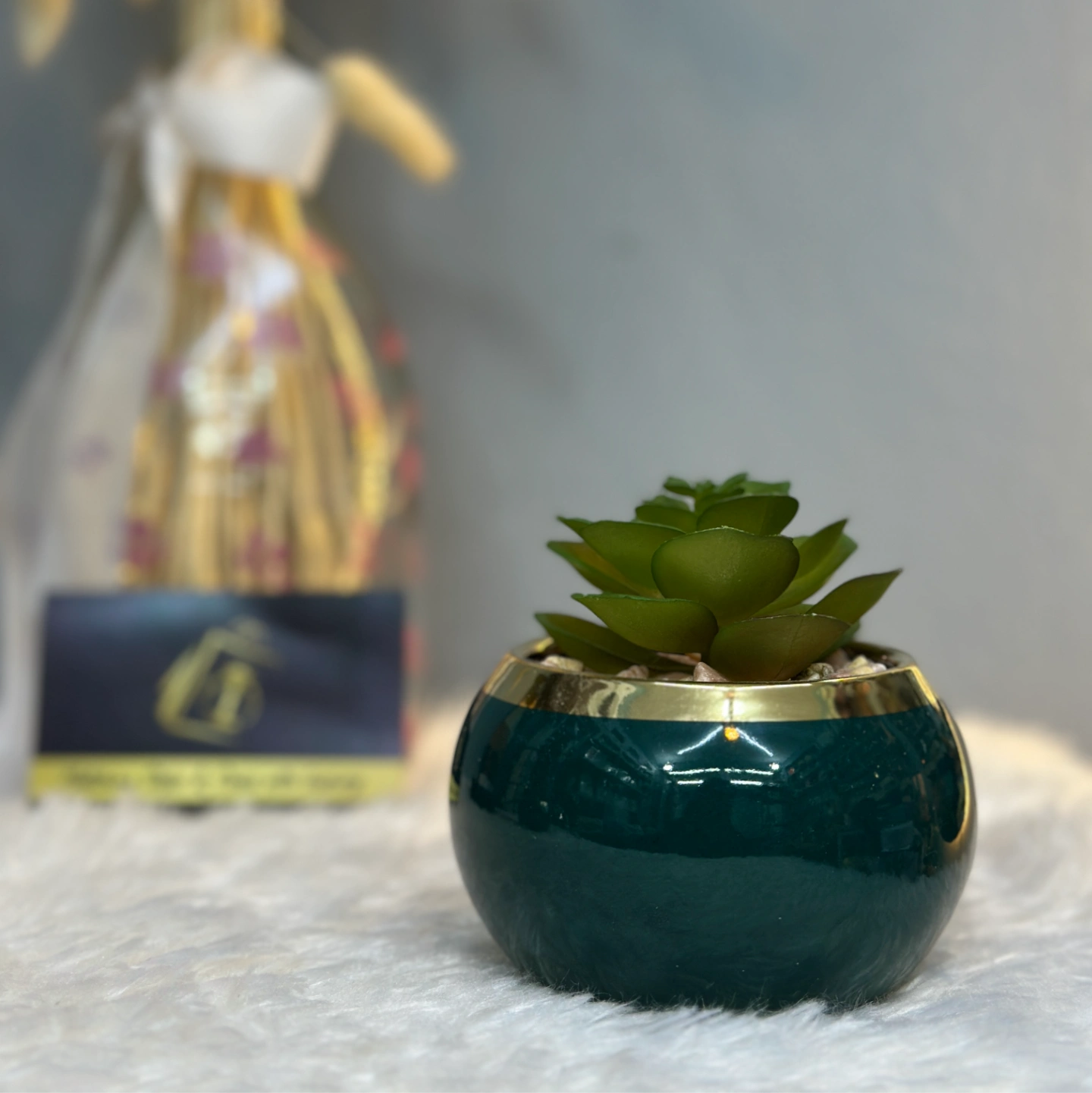 A pair of glossy emerald-green rounded pots with elegant gold-rimmed borders. These come with realistic artificial succulents, providing a pop of color and luxury to your interior decor.