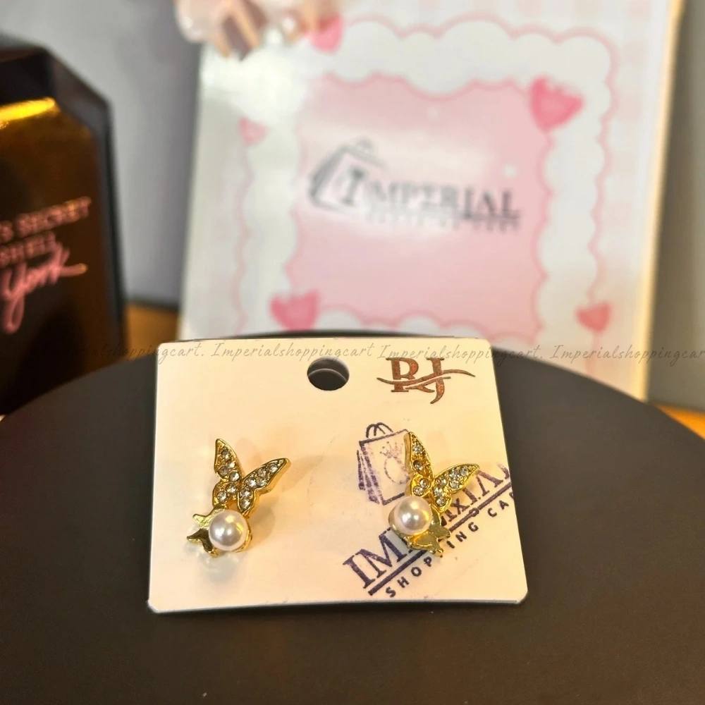 Whimsical and feminine, these studs feature a crystal-encrusted butterfly poised atop a lustrous white pearl. The gold-tone setting adds warmth to the design, making them a charming choice for special occasions.