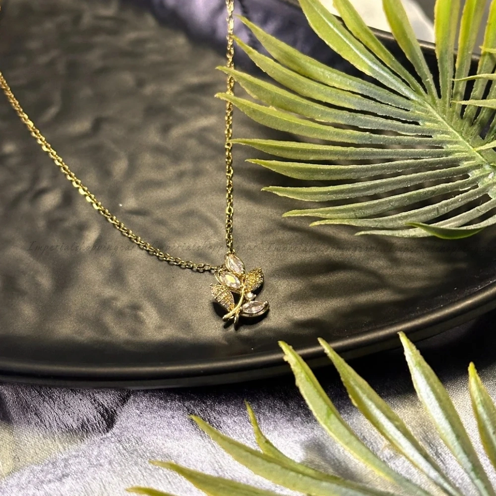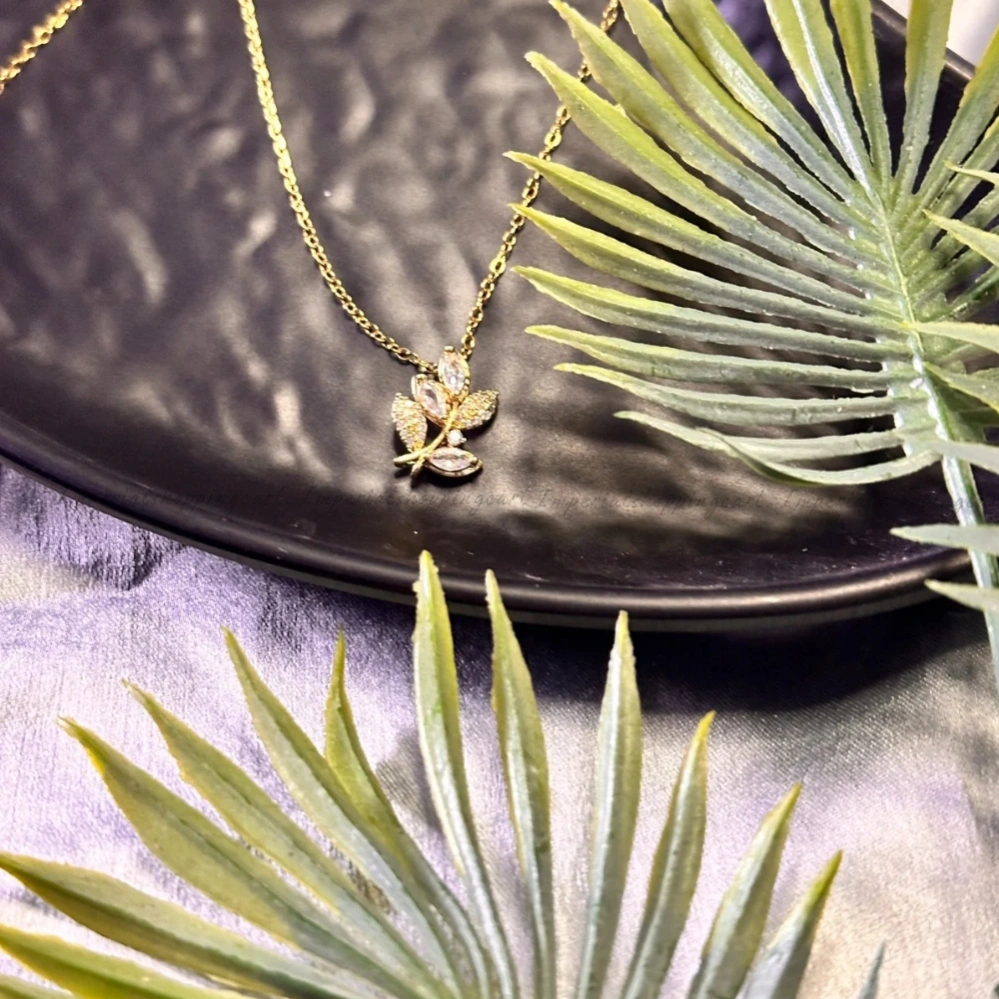 Inspired by nature, this elegant pendant features a cluster of textured golden leaves encrusted with shimmering pavé crystals. The marquise-cut stones add a touch of high-end luxury to the organic silhouette.