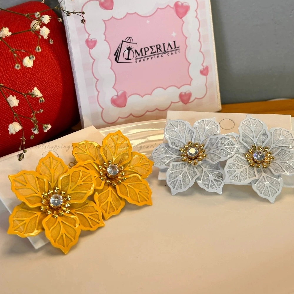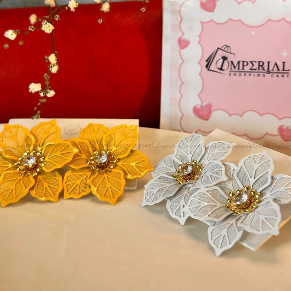 Large-scale, laser-cut metallic floral studs with a crystal center. Features intricate leaf detailing in vibrant mustard gold and matte silver.
