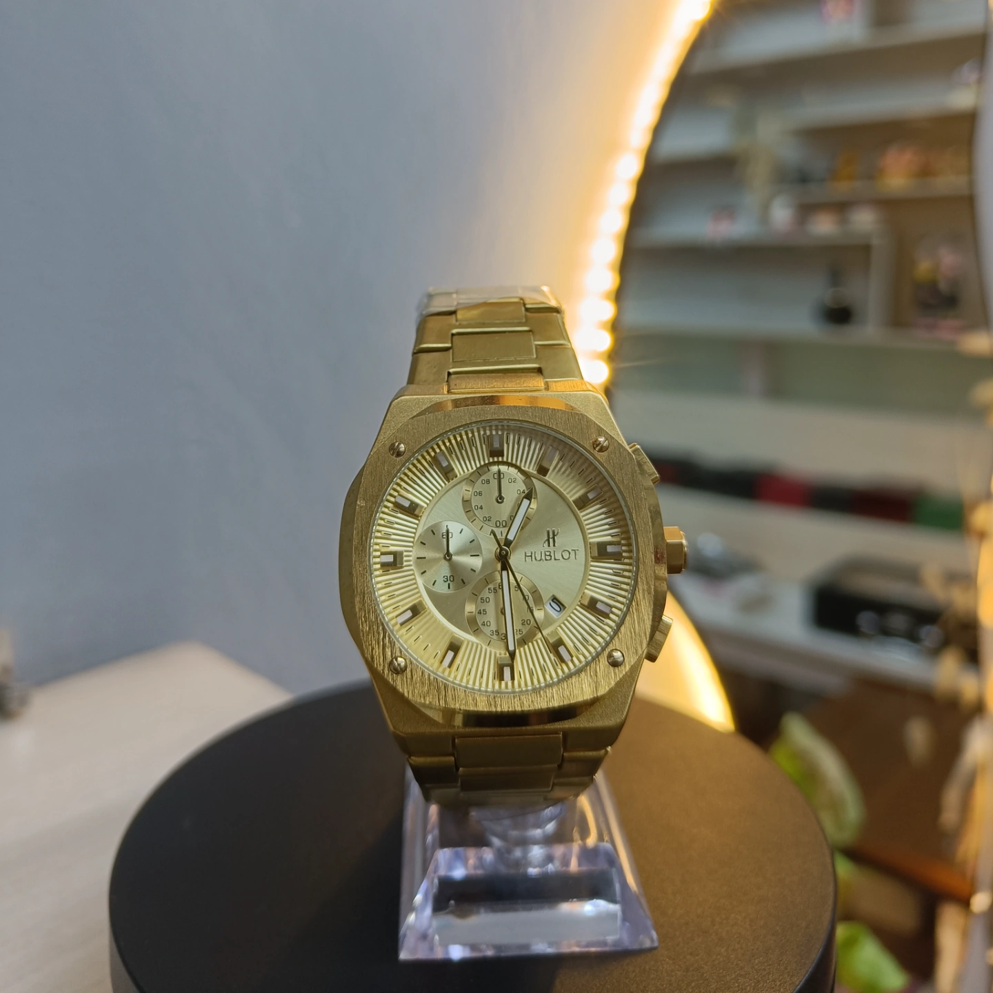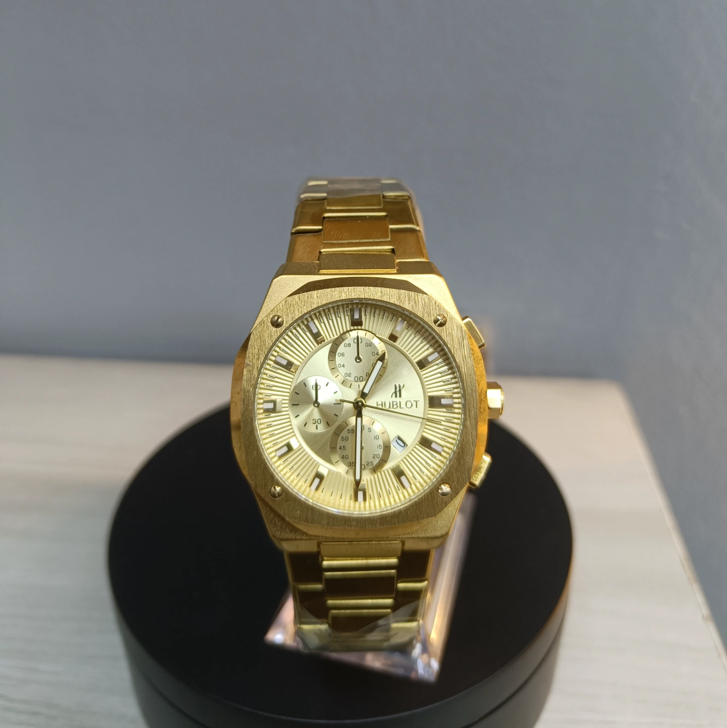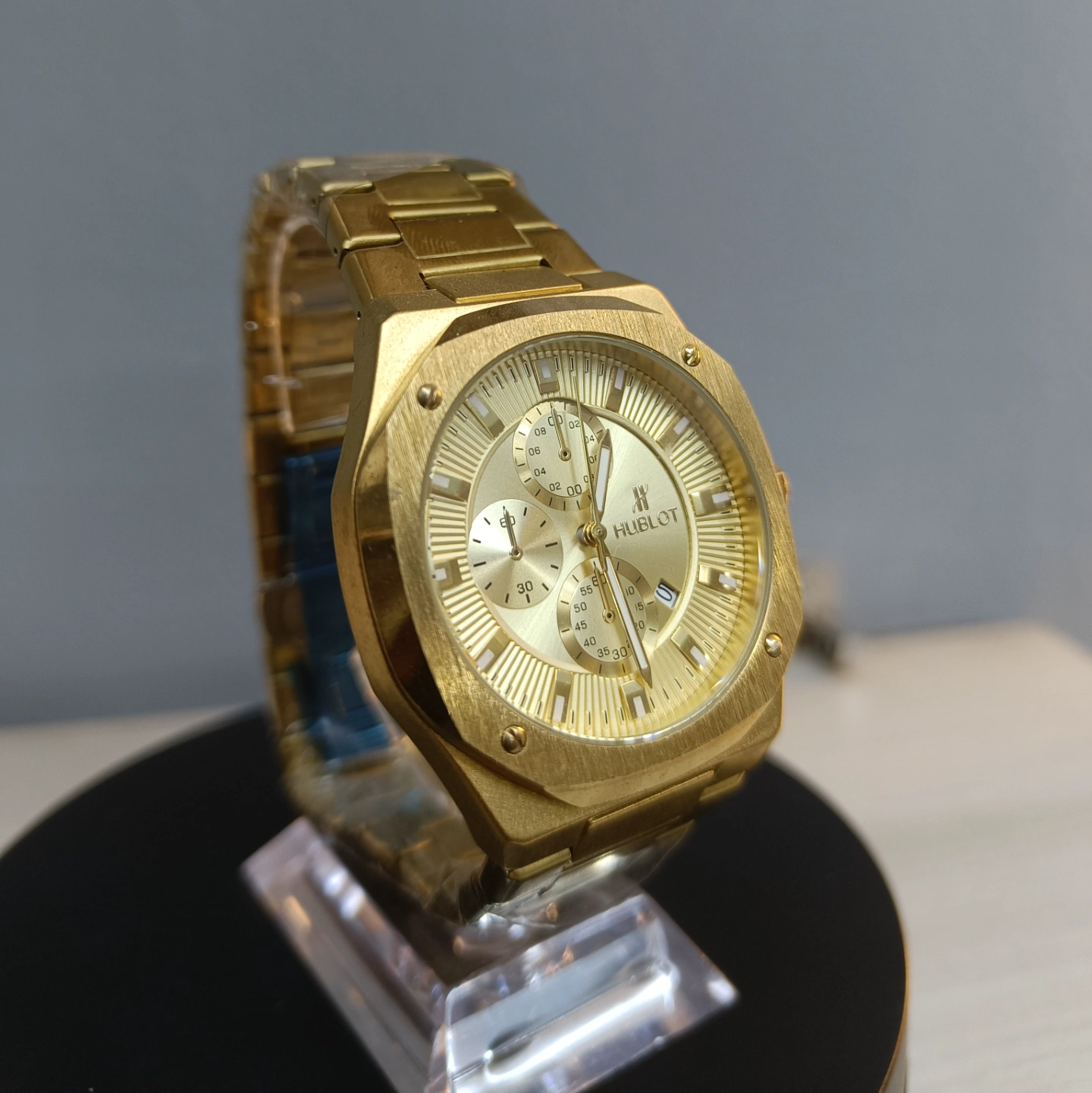 A striking, all-gold sports chronograph watch featuring a bold, octagonal case design and a textured gold dial with multi-function sub-dials.