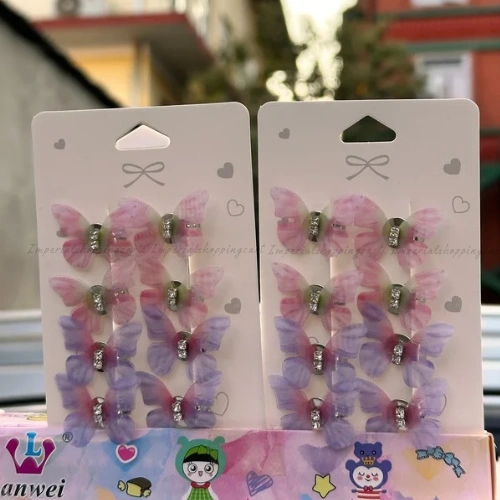 These ethereal hair clips feature translucent, double-layered fabric butterflies. They are designed with a soft gradient effect in pink and lilac hues and are finished with a sparkling rhinestone center to catch the light.