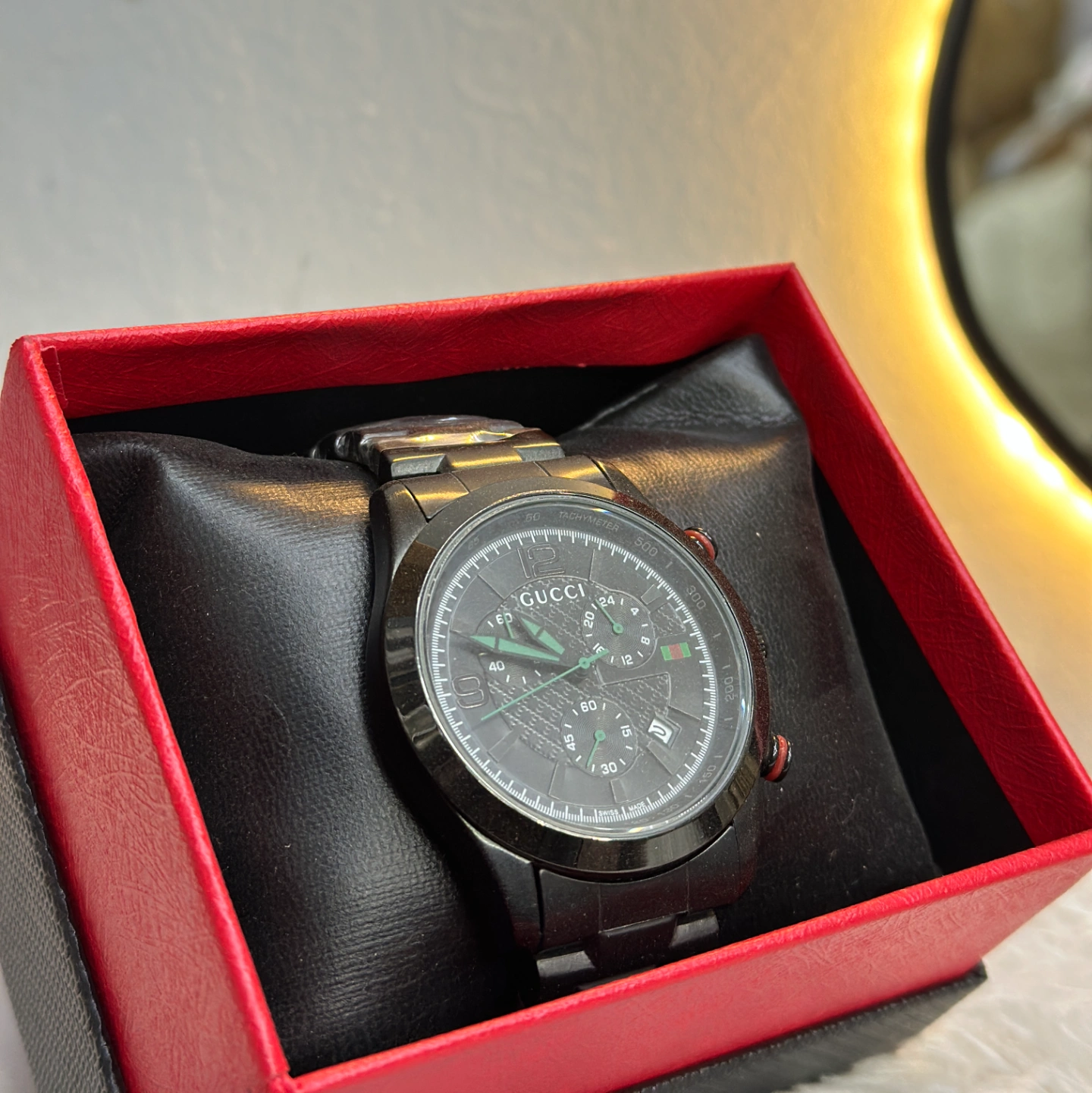 A sleek, stealthy timepiece with an all-black PVD finish. The dial features the signature Gucci pattern with vibrant green hands and the classic red/green web stripe logo at the 3 o'clock position.