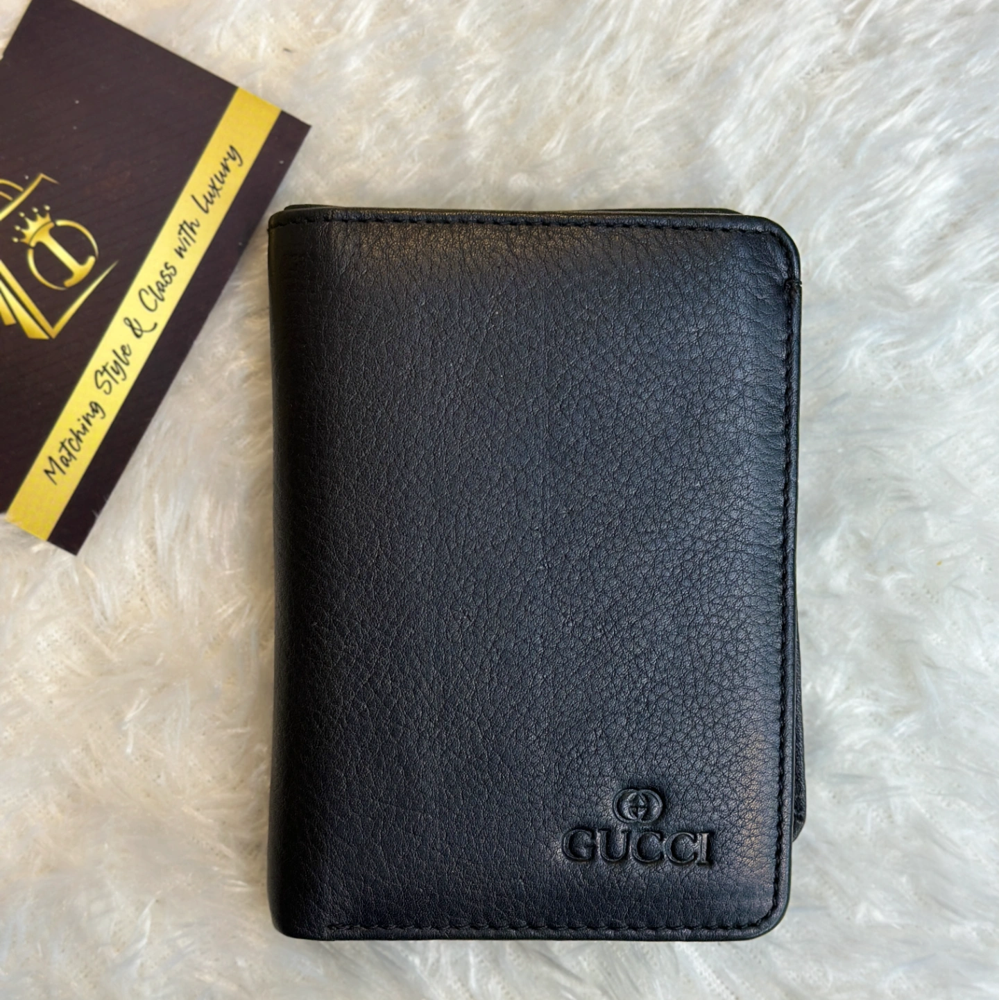 Design & Exterior: It features a black calfskin leather exterior that has been heat-stamped to achieve a "boar effect," giving it a subtle, scratch-resistant textured appearance. The front corner is accented with the iconic Double G hardware in a brass/gold-toned finish.