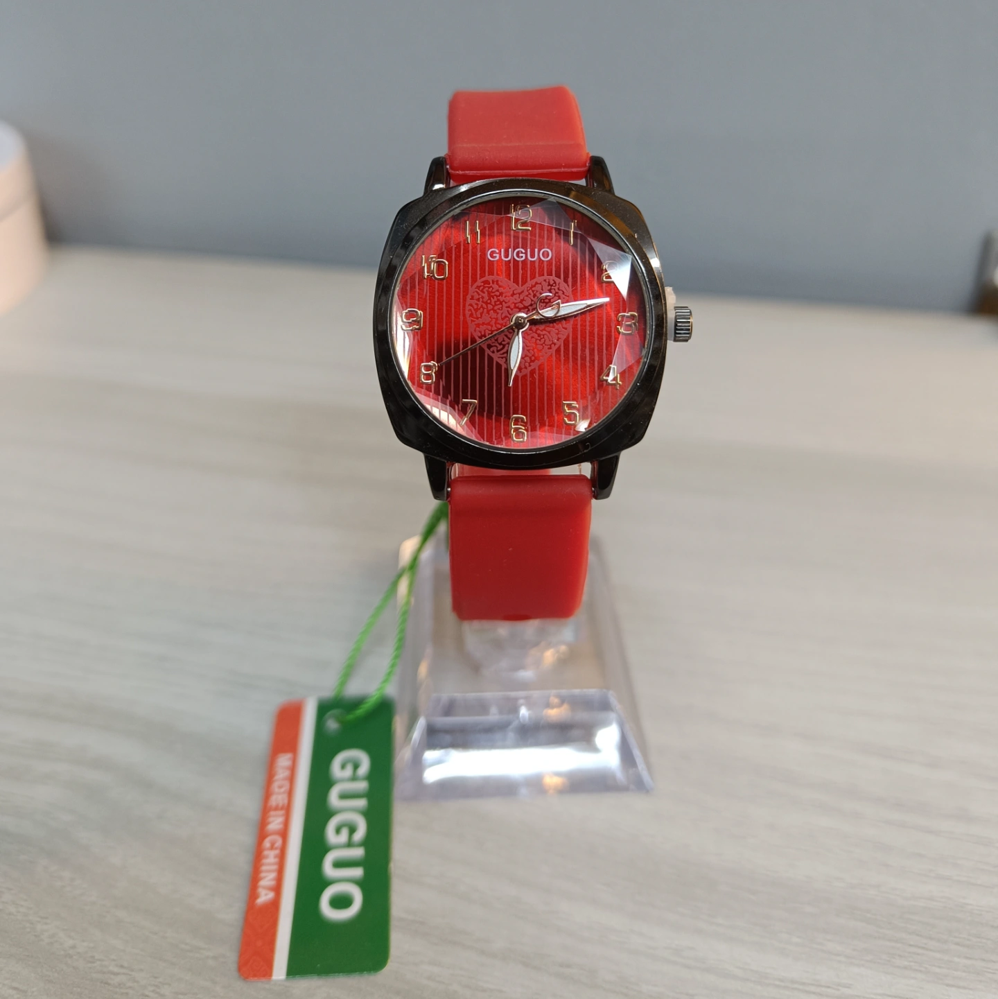The dial is dominated by a textured, vertical striped pattern with a central heart design, perfect for a vibrant, casual look.