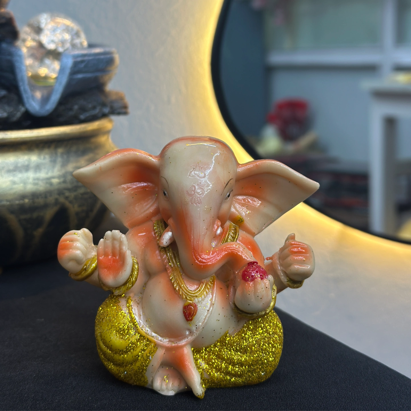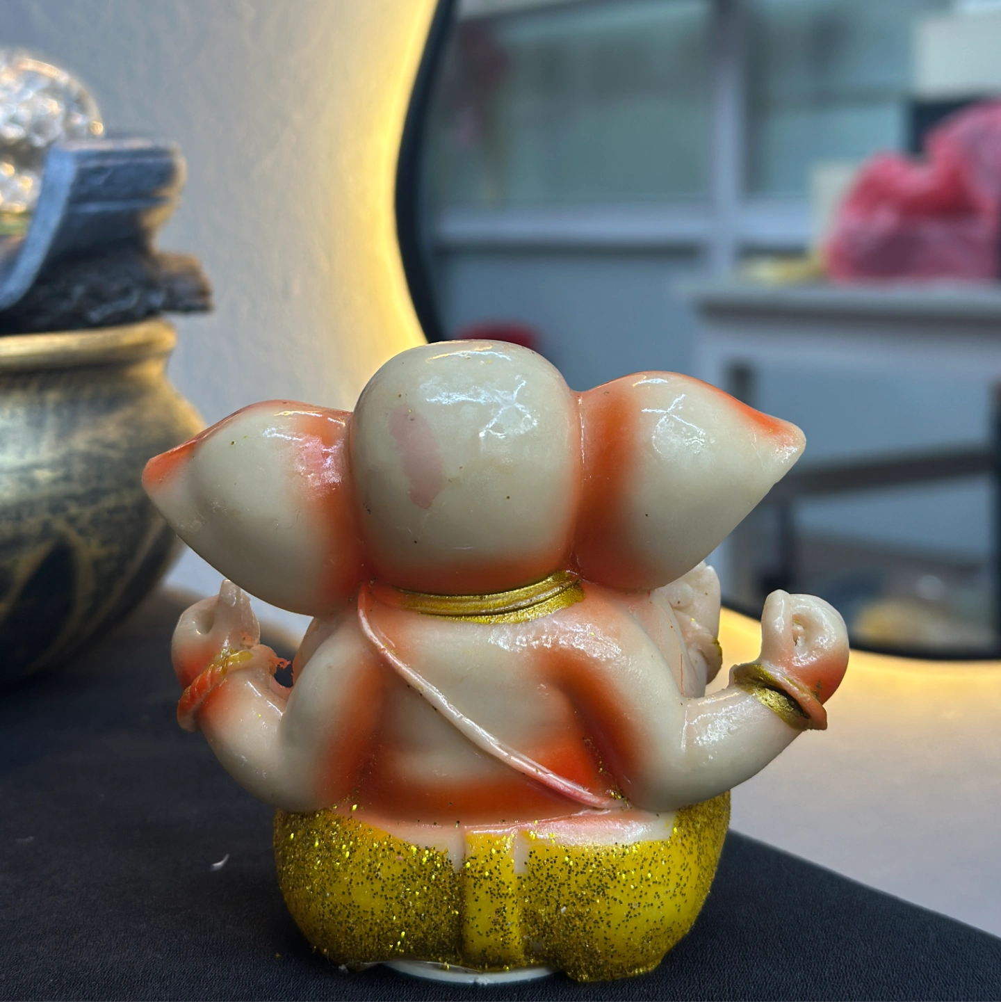 A beautiful and auspicious statue of Lord Ganesha, the remover of obstacles. Hand-painted with vibrant orange accents and a sparkling golden base, this piece brings positive energy to any desk or altar.