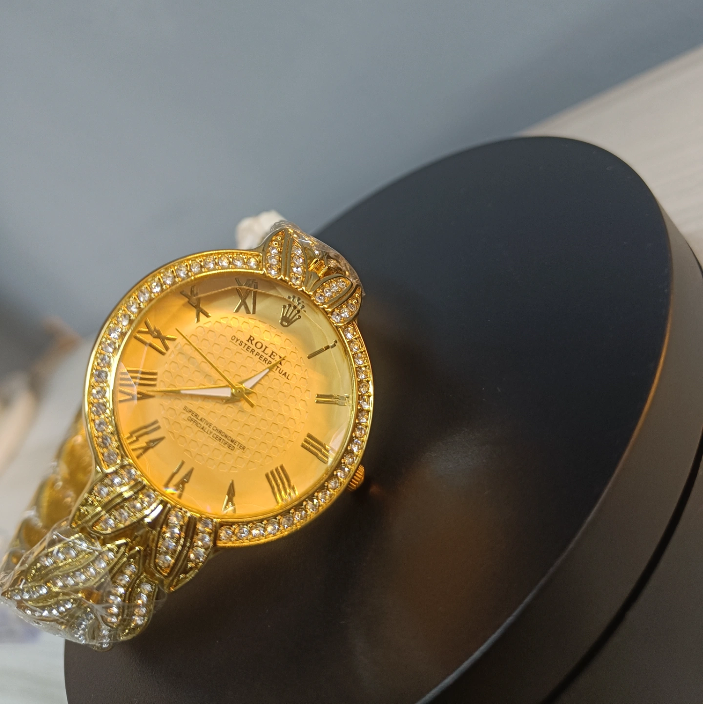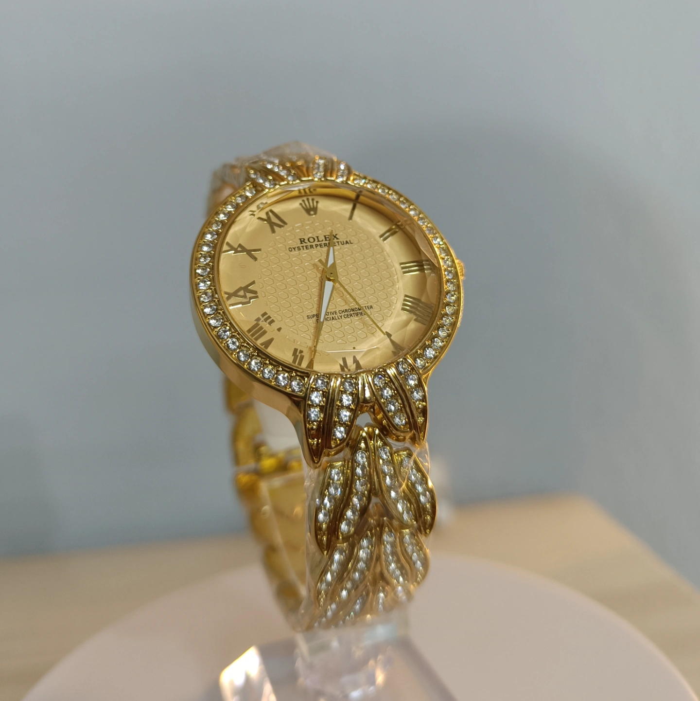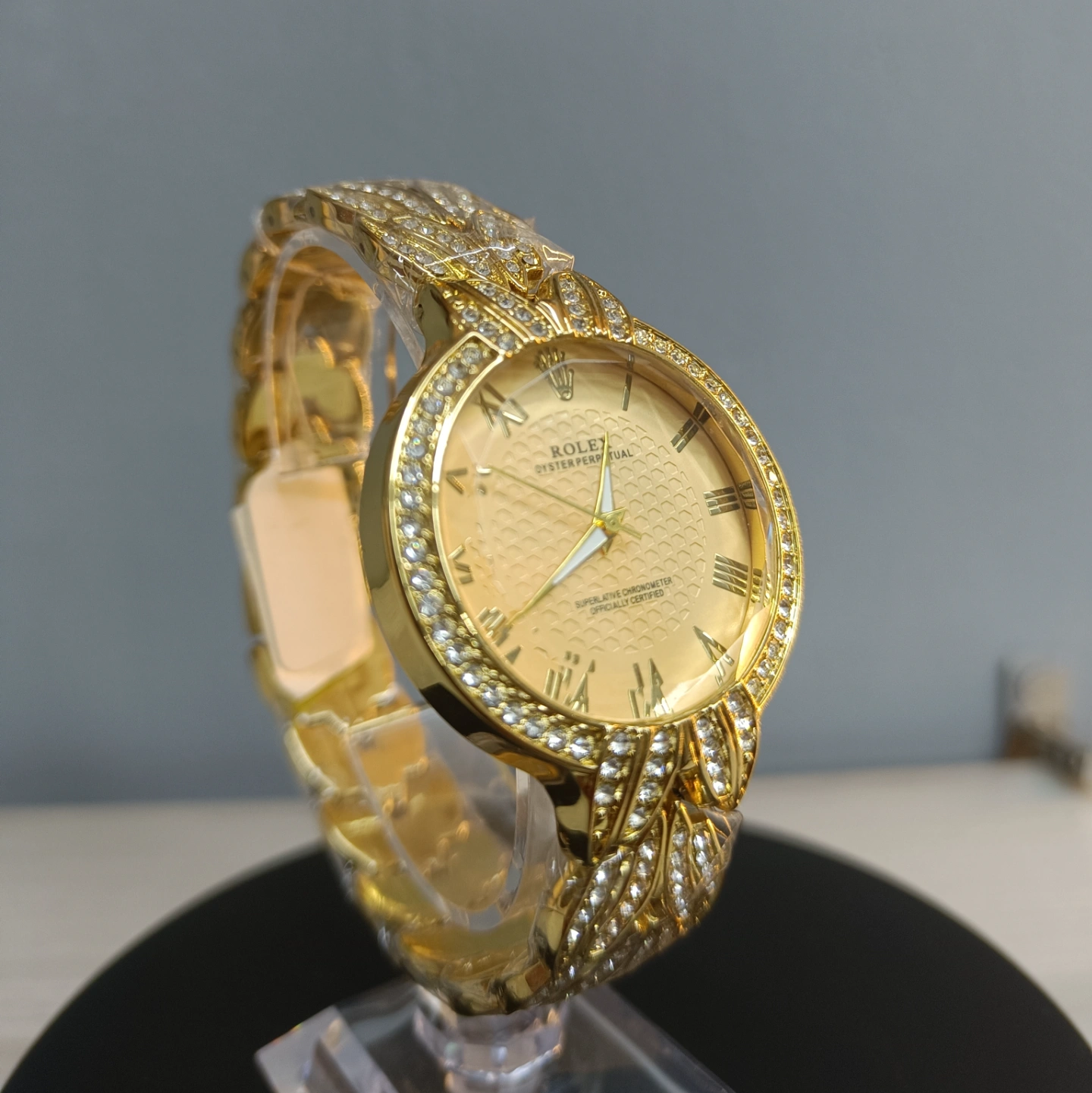 The gold-toned, textured dial boasts classic Roman numerals, encircled by a brilliant, pave-set diamond bezel.