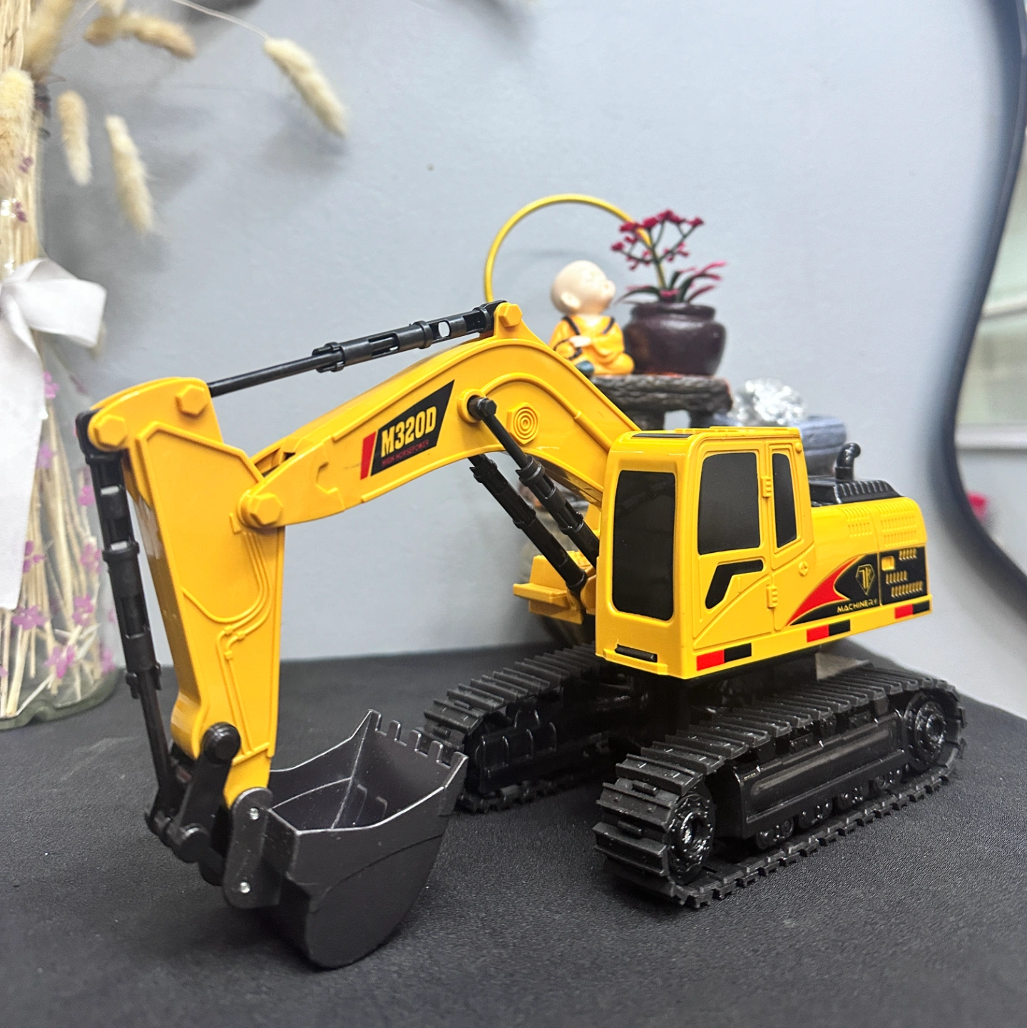 Description: A highly detailed 1:24 or 1:16 scale replica of a heavy-duty hydraulic excavator in classic construction yellow. It is modeled after industrial machinery like the Caterpillar 320D.