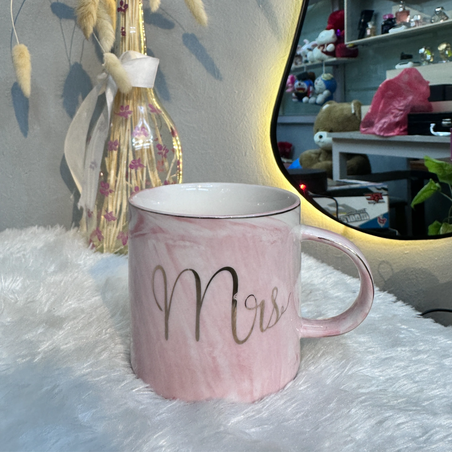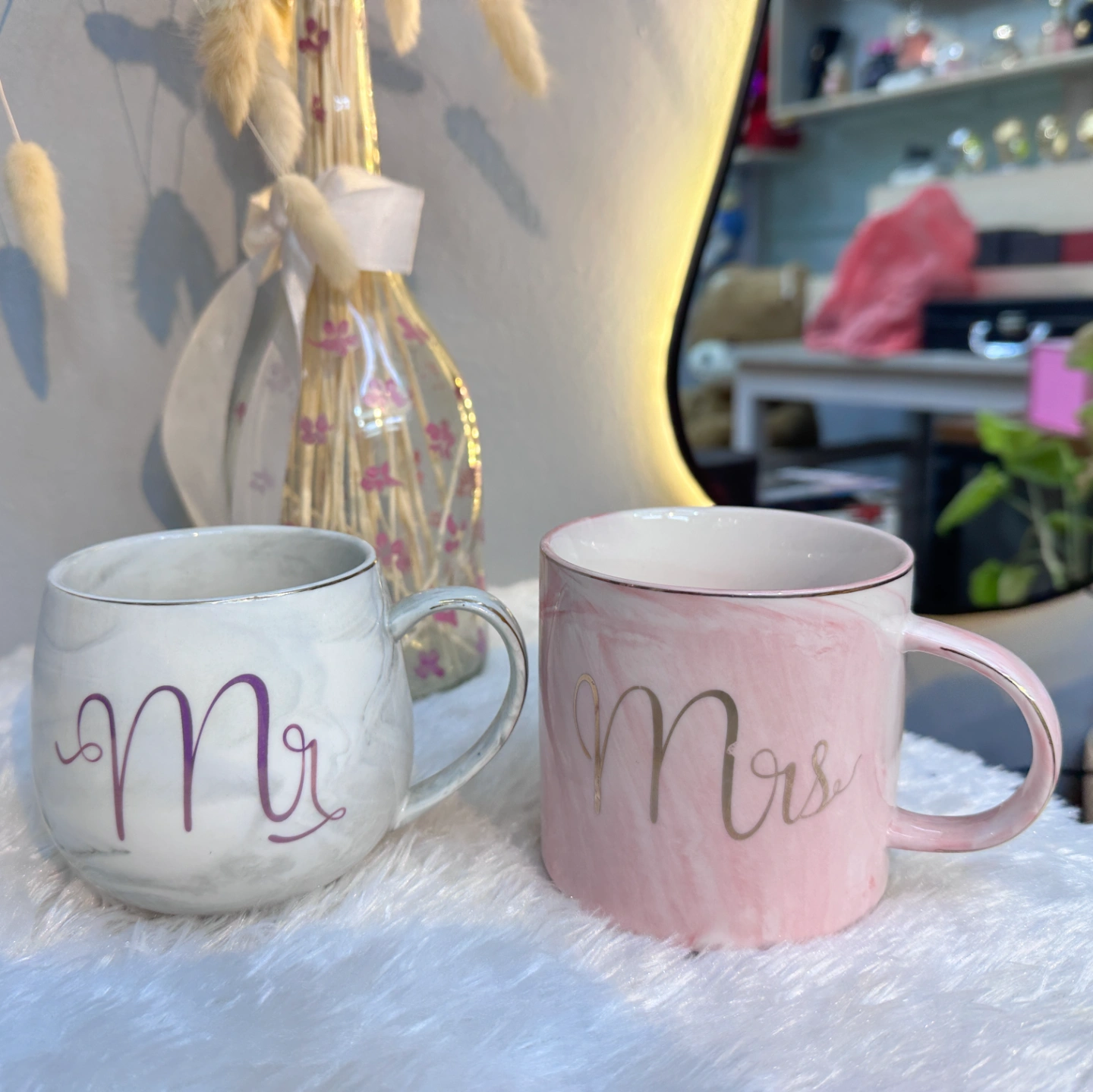 A stunning pair of marble-textured mugs designed for the perfect couple. One features a grey marble finish with "Mr." in elegant script, while the other boasts a soft pink marble finish with "Mrs." Highlighted with gold-rimmed edges, these mugs make an unforgettable wedding or anniversary gift.