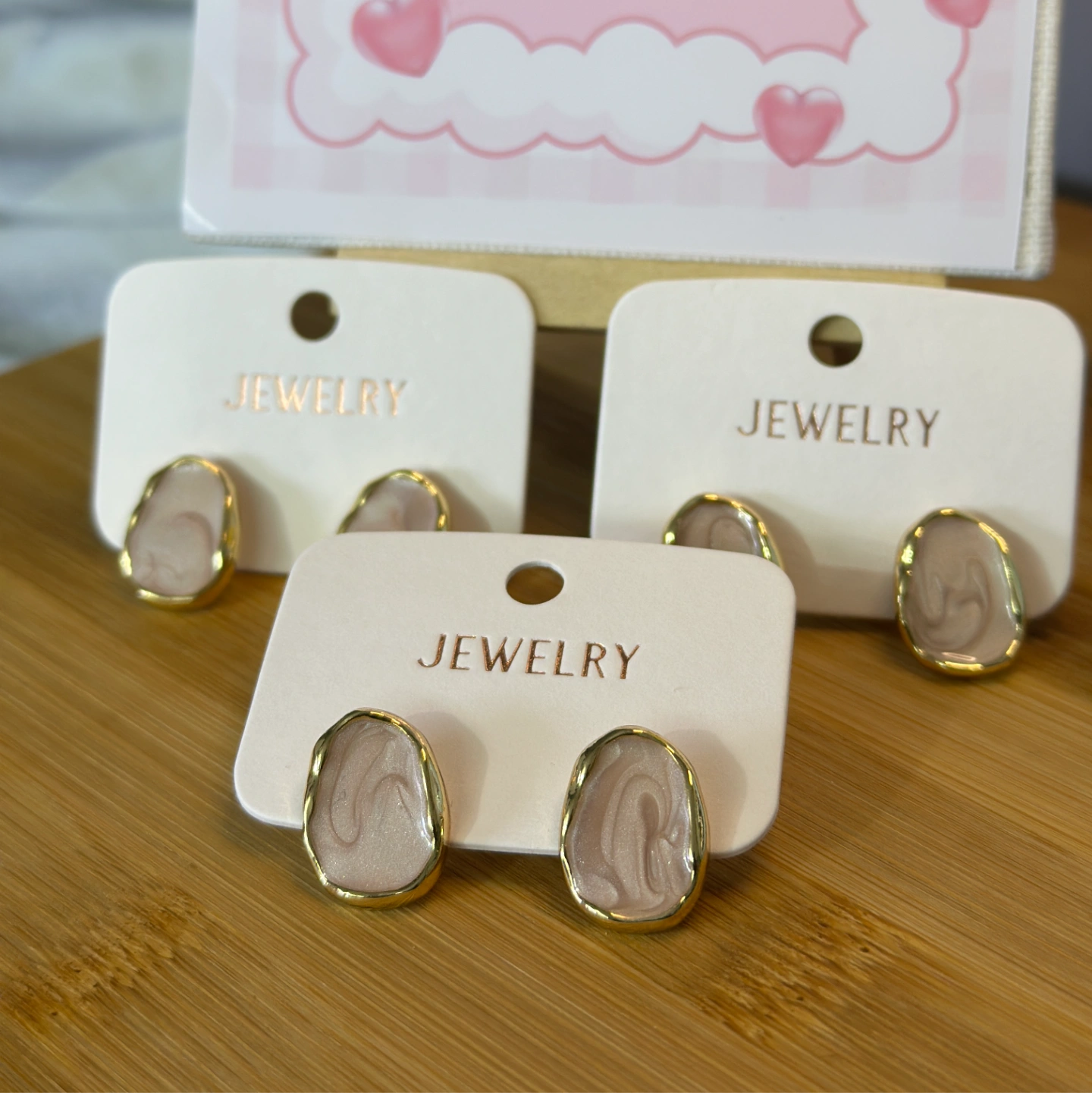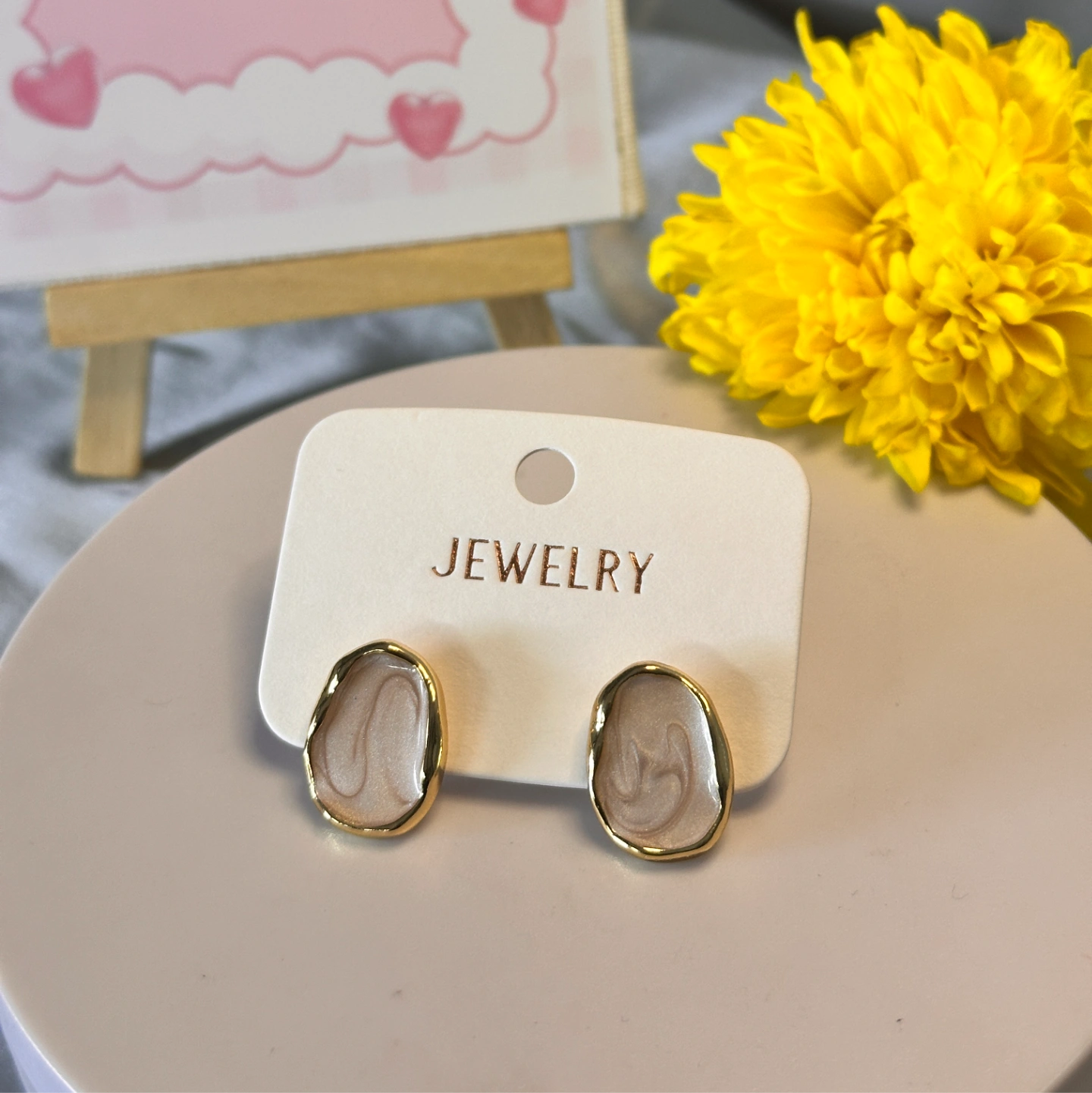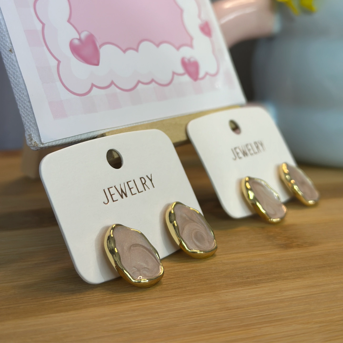 Embrace organic beauty with these uniquely shaped marble-effect earrings. Each piece features a soft, swirling blend of cream and dusty rose, encased in an irregular gold border that mimics the beauty of natural river stones.