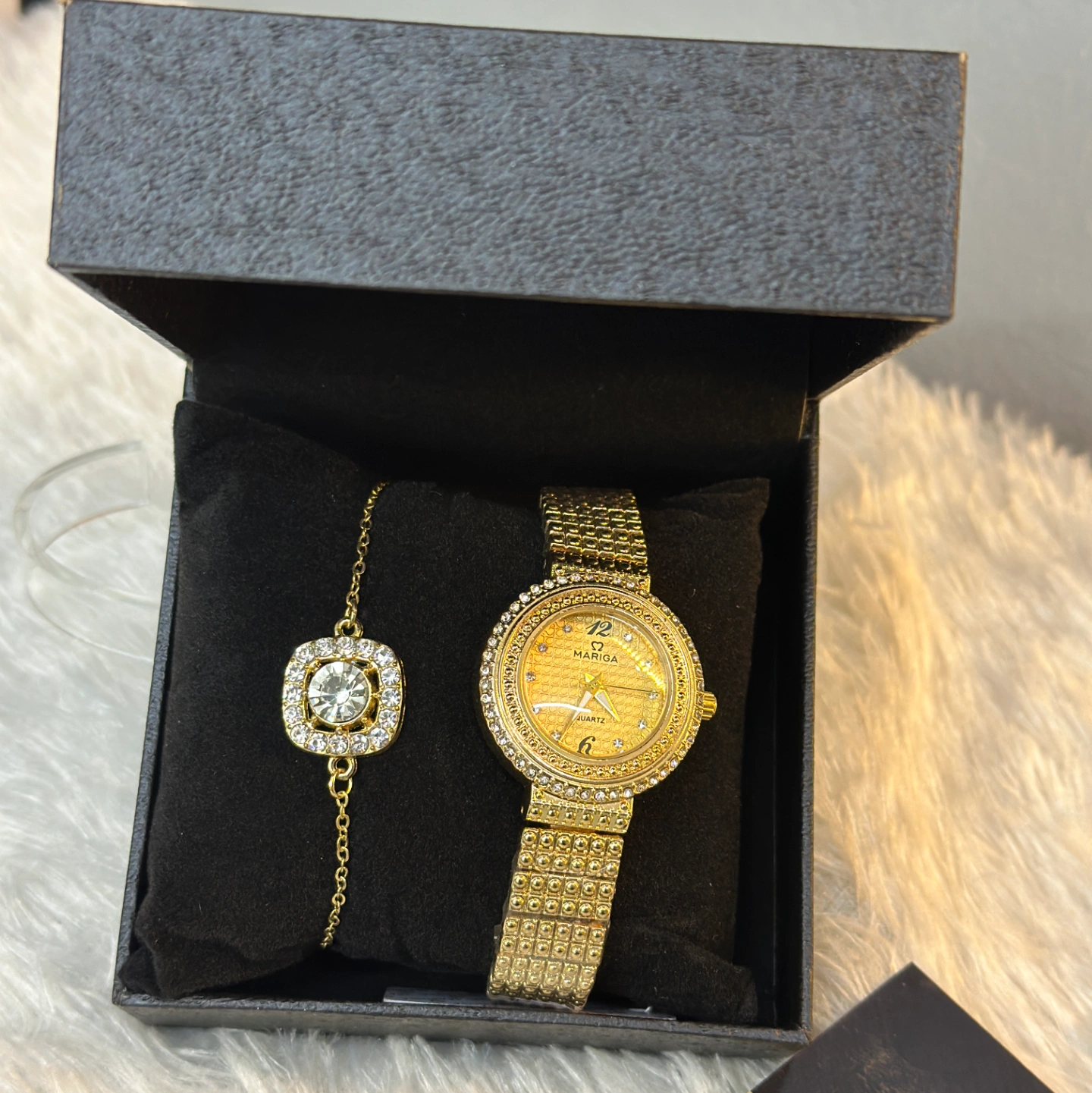 A luxurious jewelry set featuring a gold-finished watch with a crystal-encrusted bezel and a textured "sunray" dial. It comes with a matching square-link bracelet centered with a large sparkling stone.