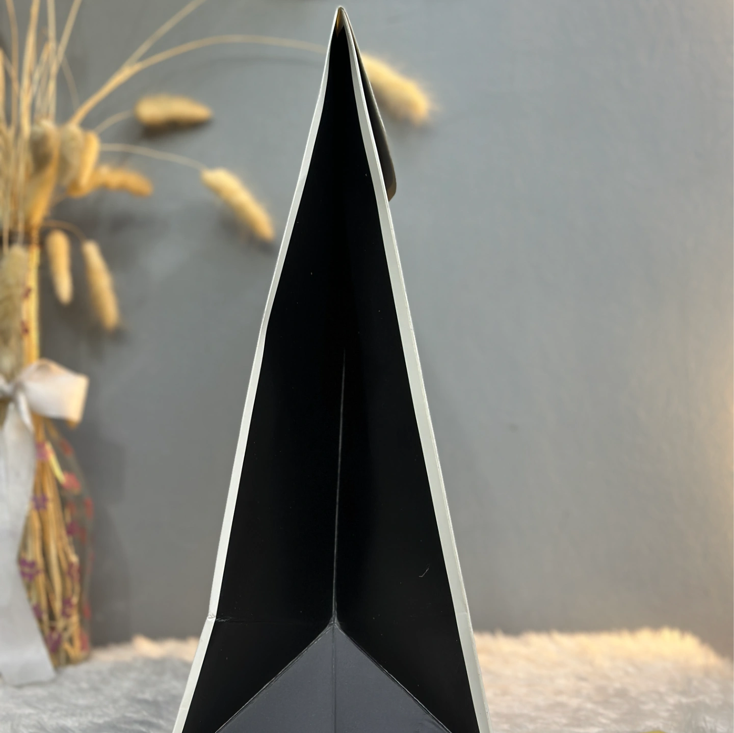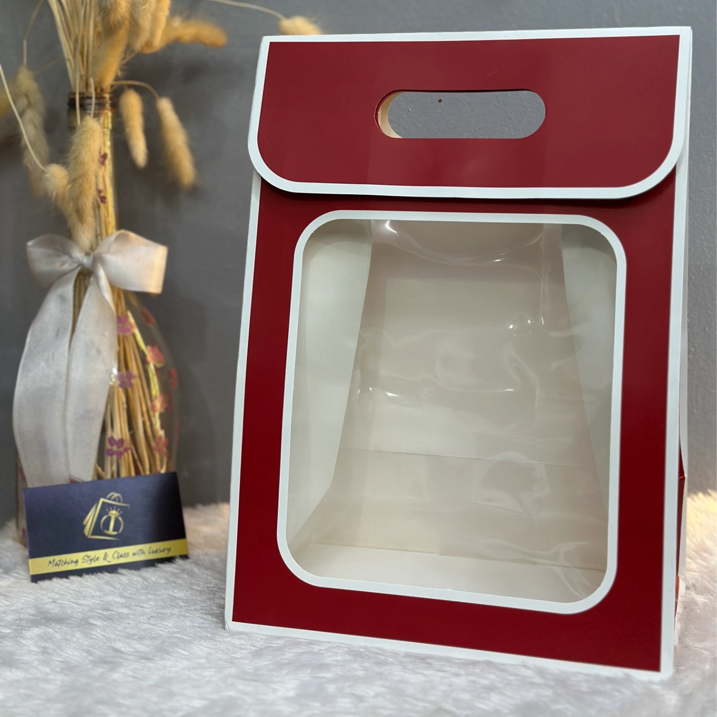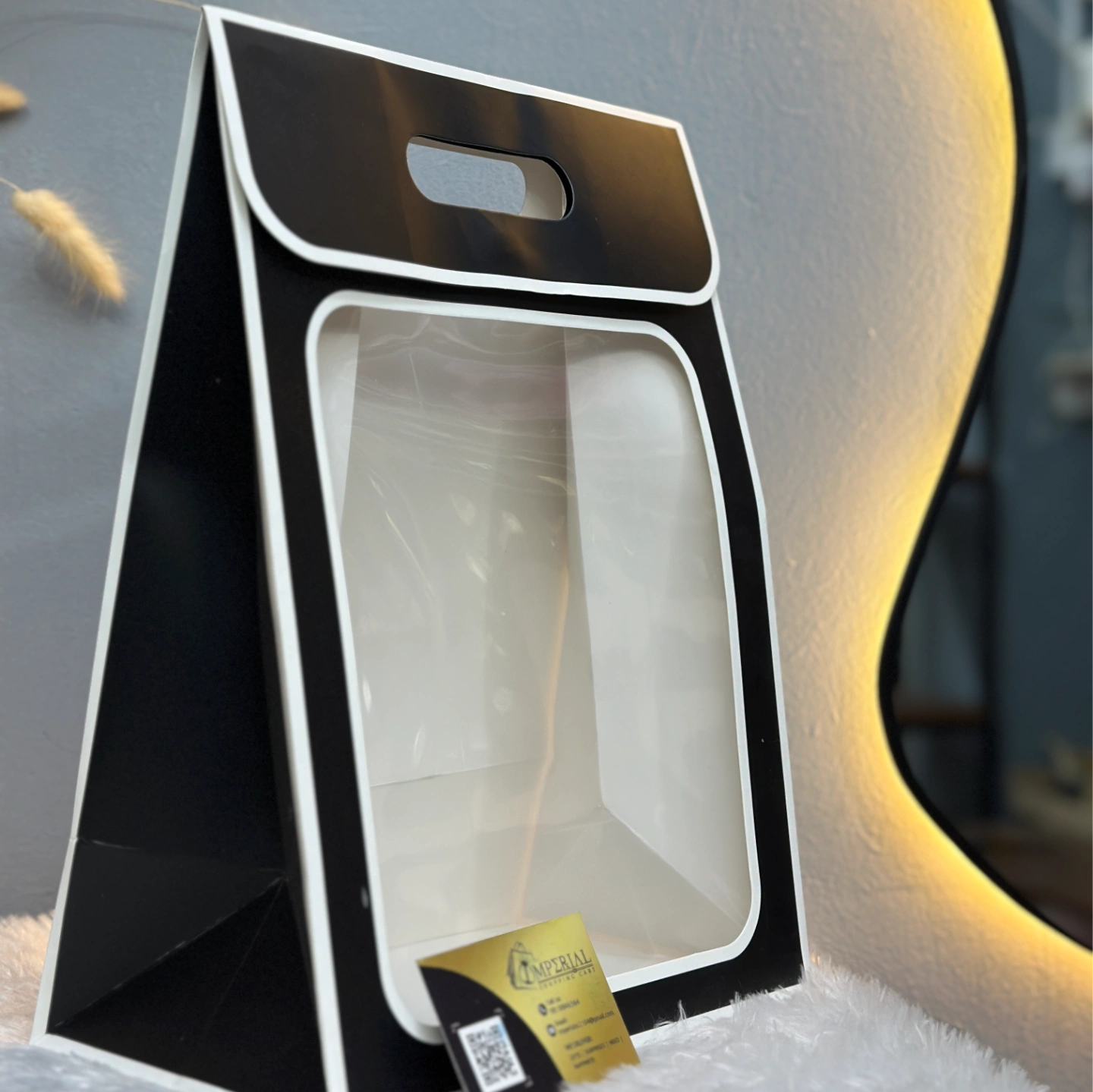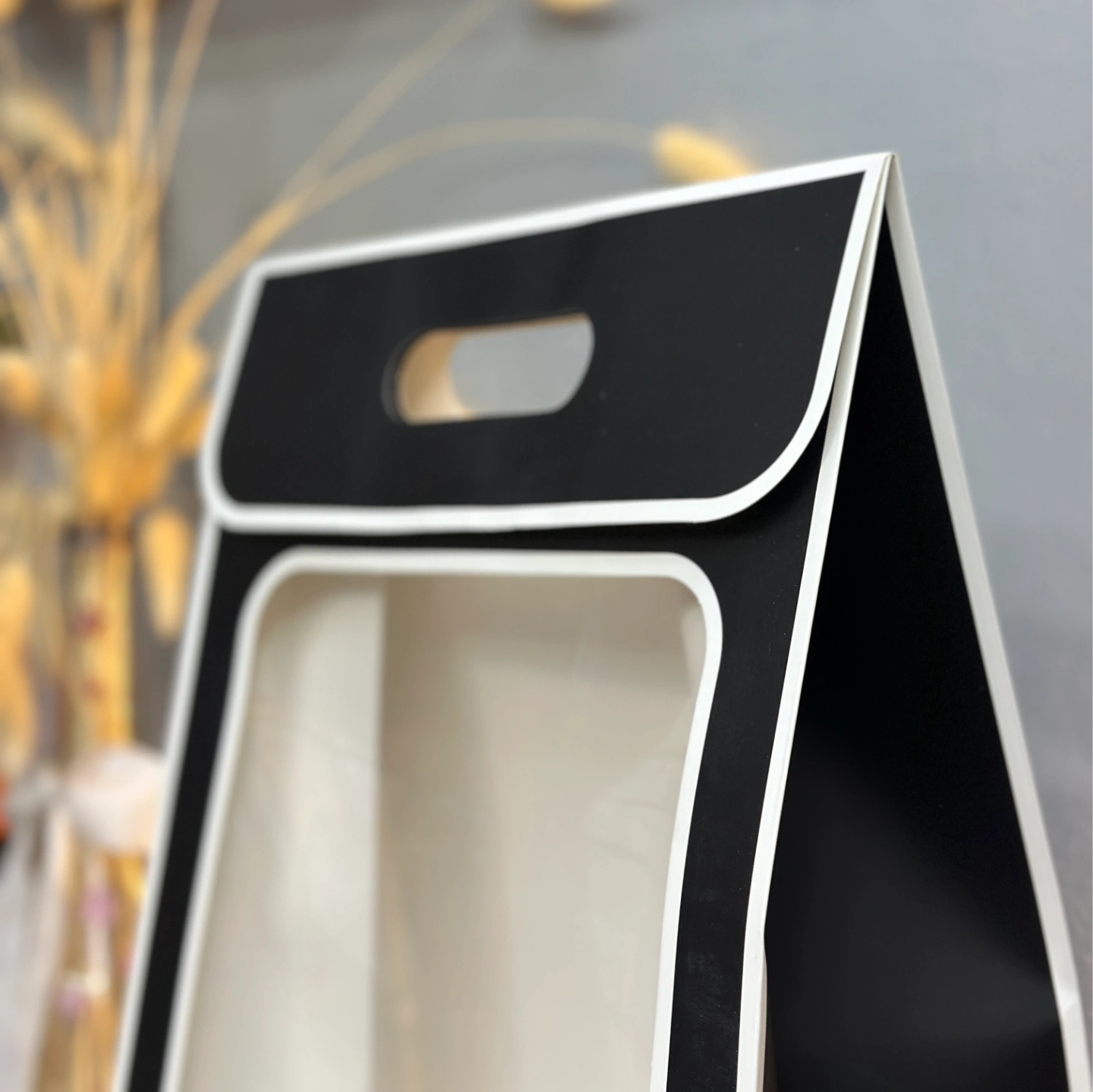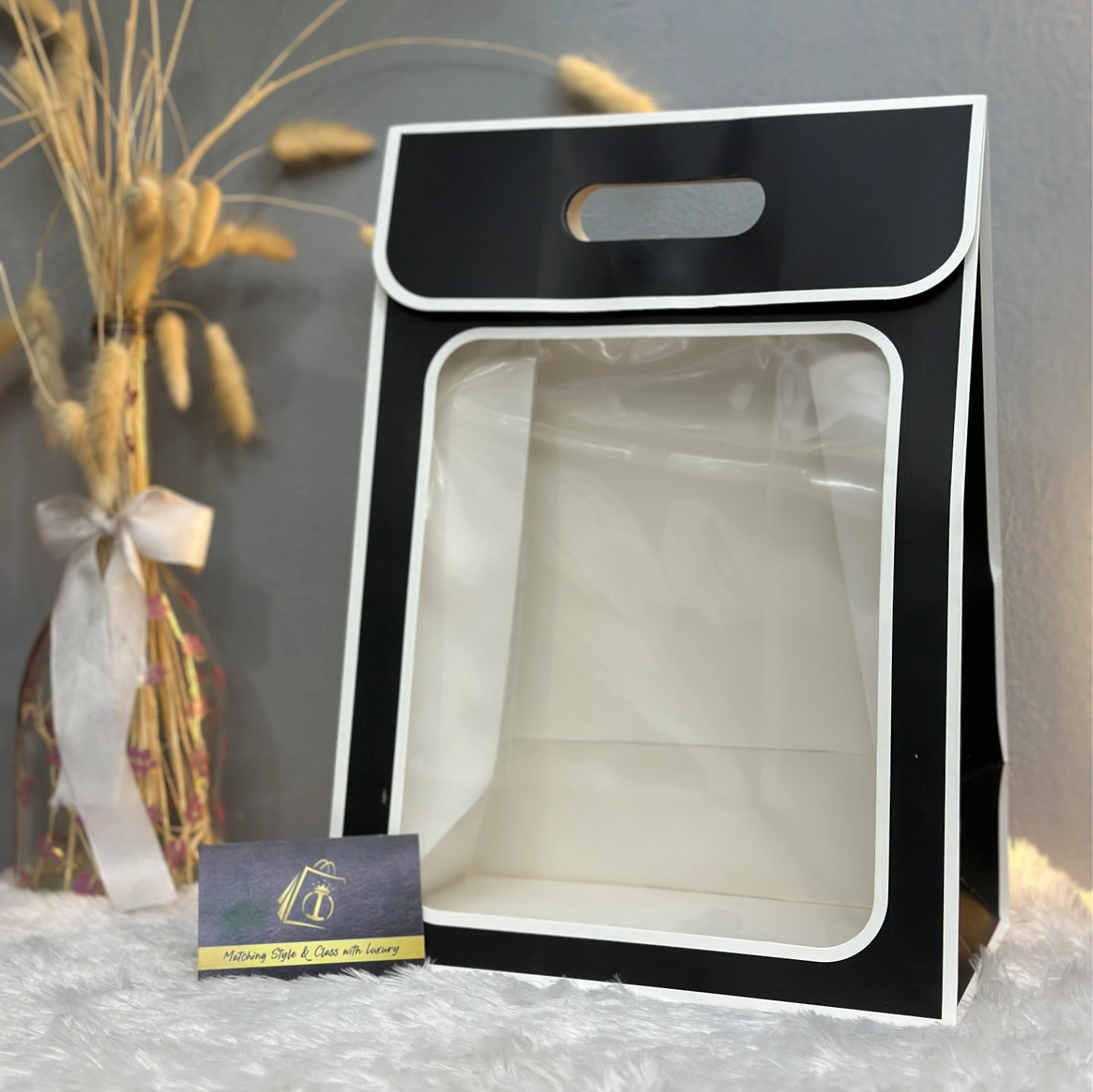 A sleek, matte black gift bag featuring a die-cut handle and a large clear display window. The minimalist white border adds a crisp, high-contrast finish.