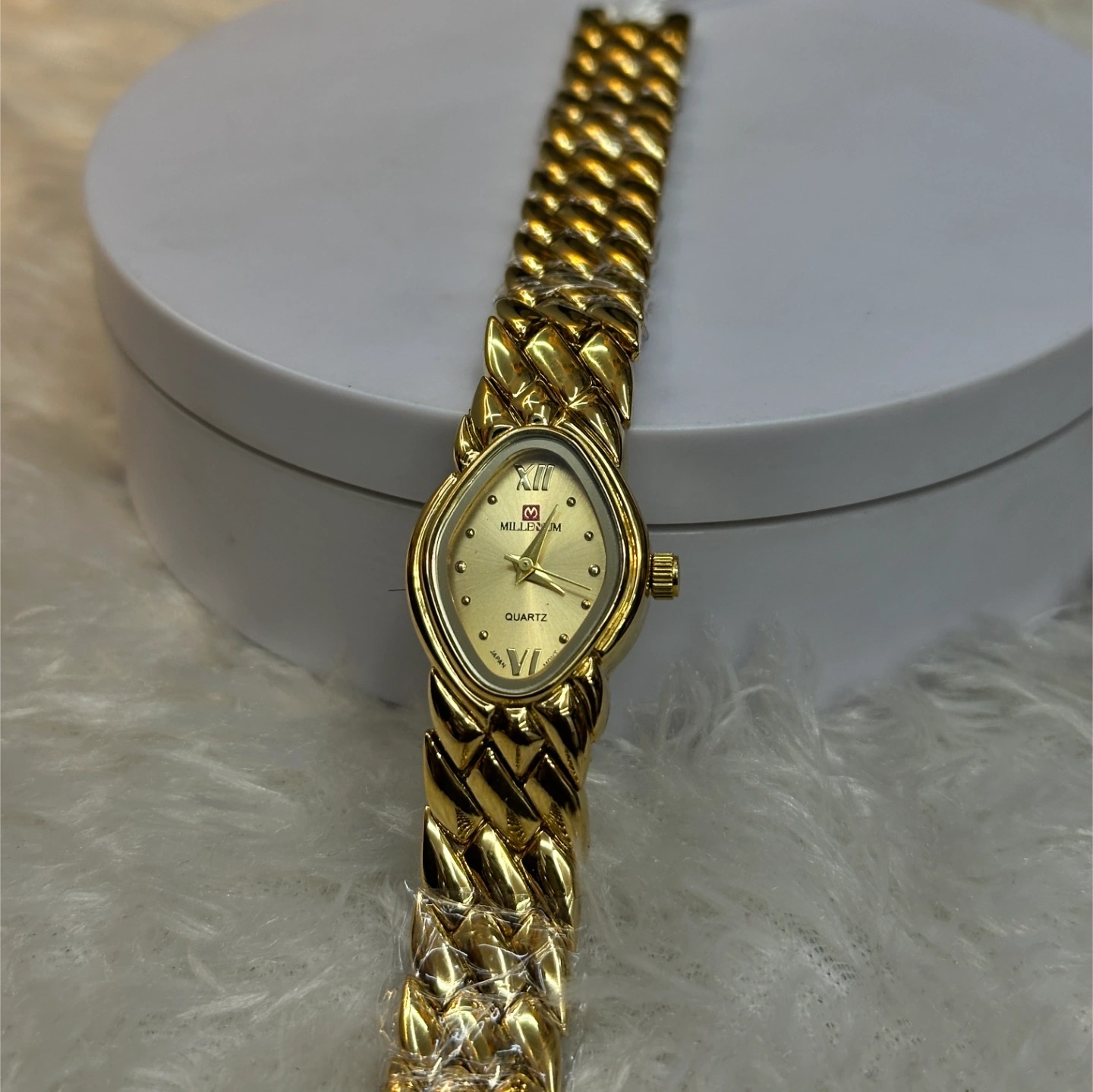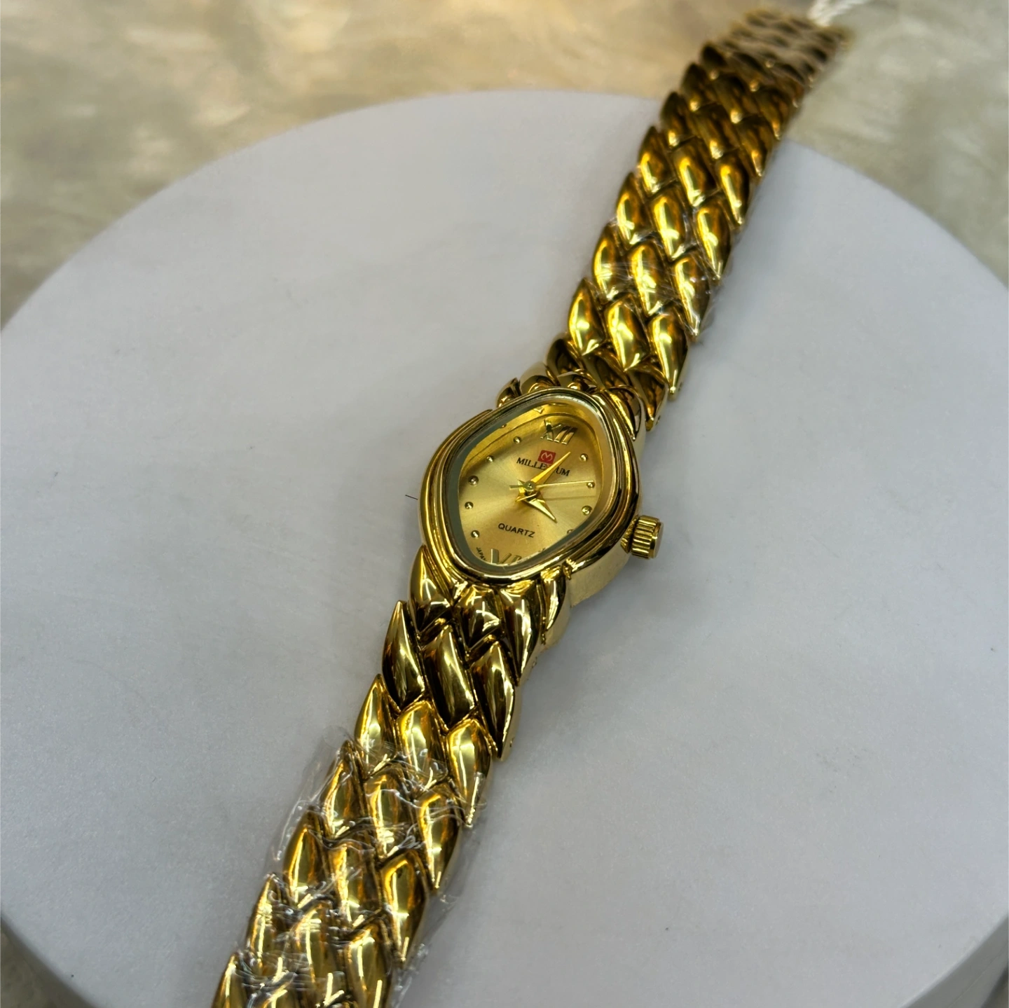 A distinctive gold-tone watch featuring a unique teardrop-shaped (or leaf-shaped) case. The dial is champagne-colored with Roman numerals at 12 and 6. The most striking feature is the thick, braided chevron-style bracelet that blends seamlessly into the case.