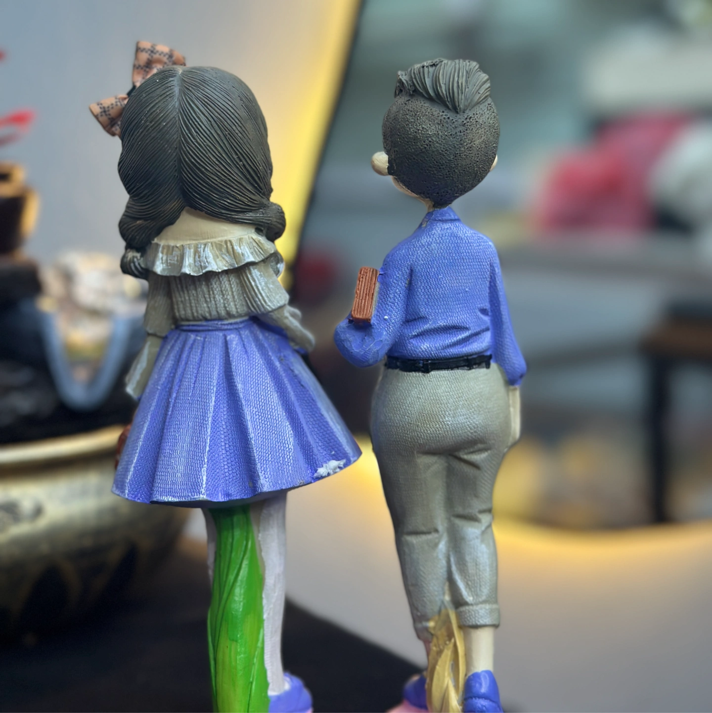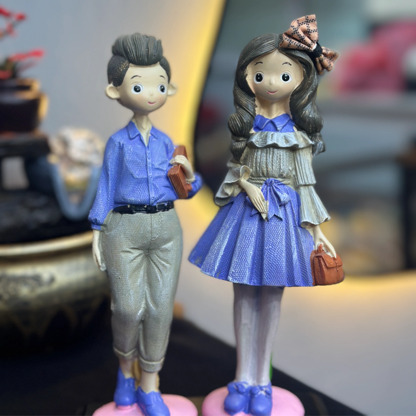 A stylish and modern figurine set depicting a trendy couple in contemporary blue and purple attire. Their minimalist design and soft colors make them a great gift for anniversaries or home decor.