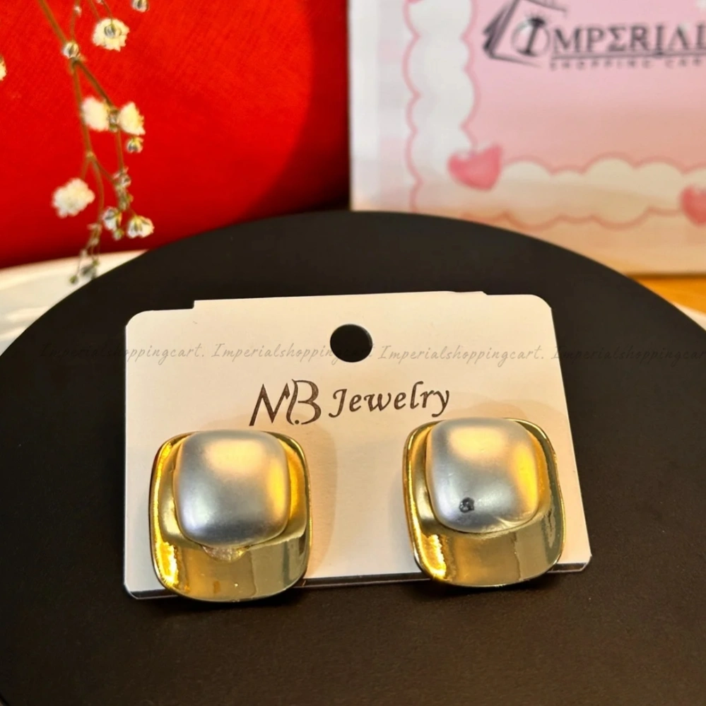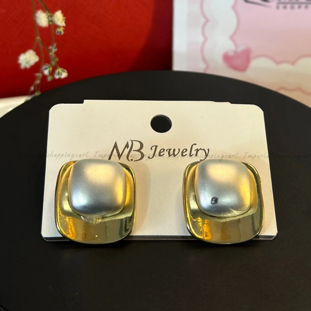 A bold, contemporary take on pearls. Oversized square-cut pearls are nestled in a chunky, high-polish gold frame for a chic, architectural vibe.